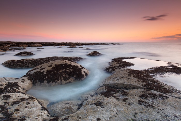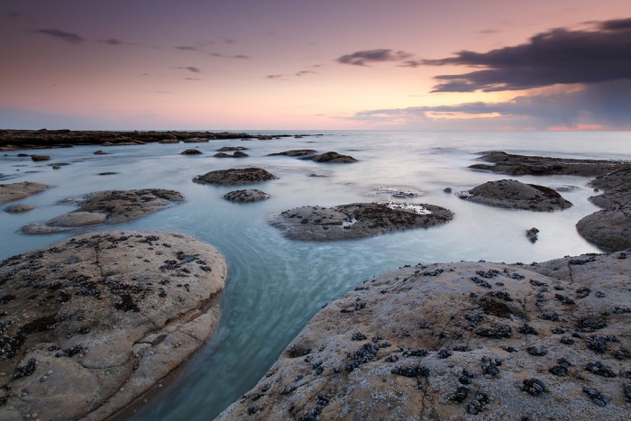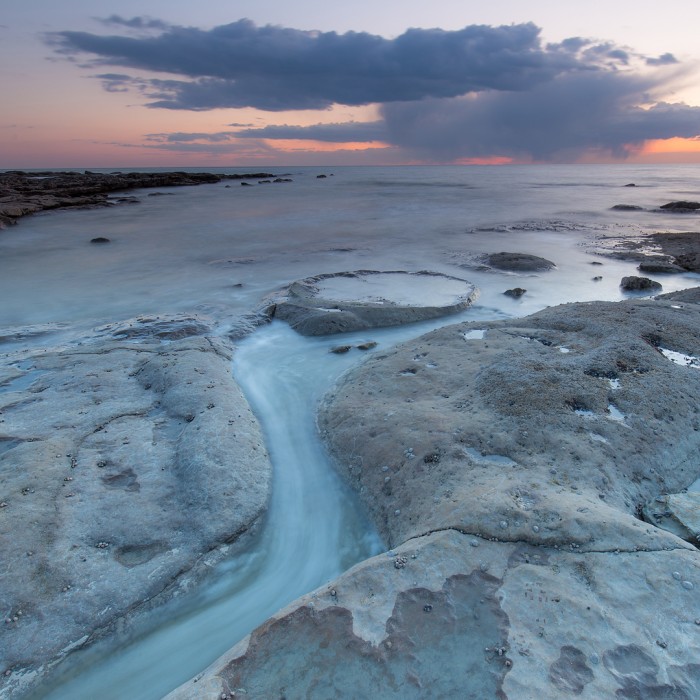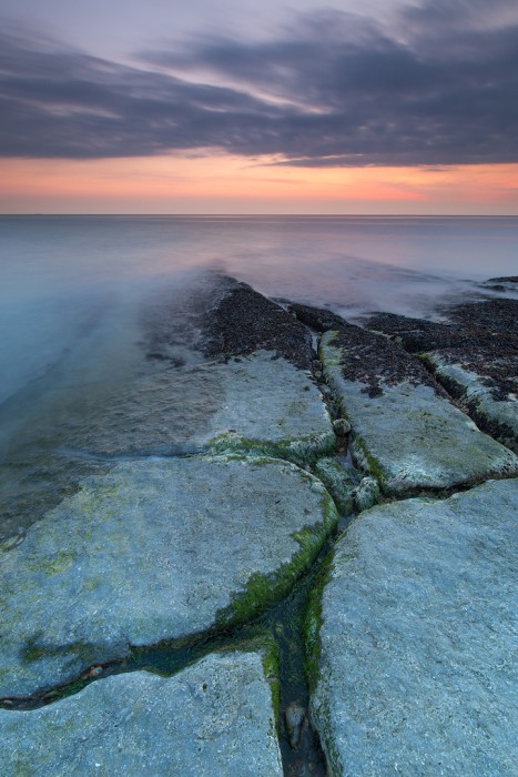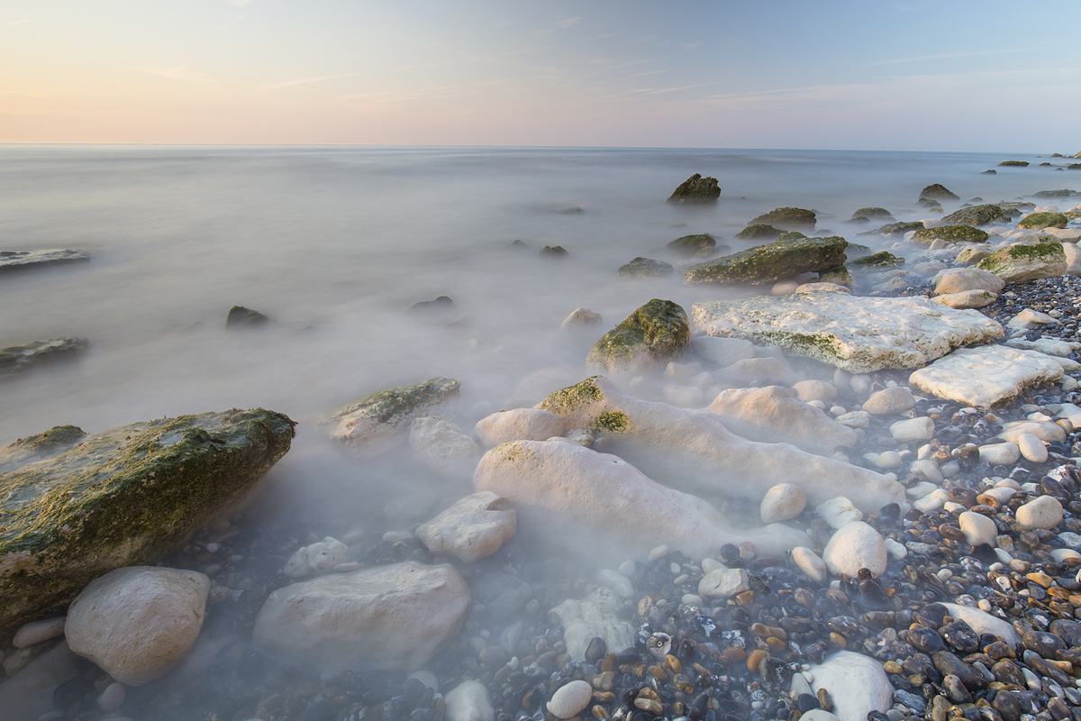 De eerste avond was er weinig golfslag en stond het water tot de witte stenen van Cap Blanc Nez. Voordeel daarvan was dat de donkere stenen buiten beeld bleven en er een mooie zachte sfeer in de foto’s ontstond. Doordat je feitelijk maar een 1 – 1,5 meter brede strook hebt waar je kunt fotograferen was de speelruimte voor een goede compositie echter nogal beperkt. De groene steen in de foto hierboven hielp me wel om wat spanning in de foto te krijgen.