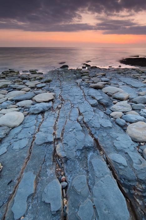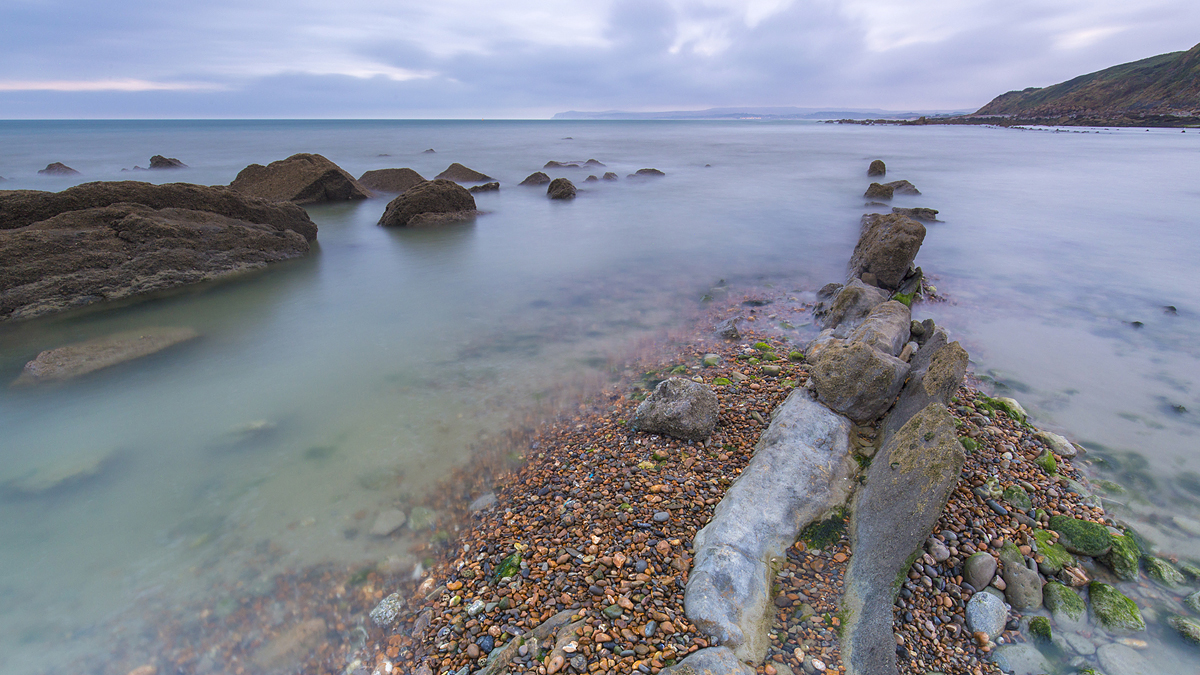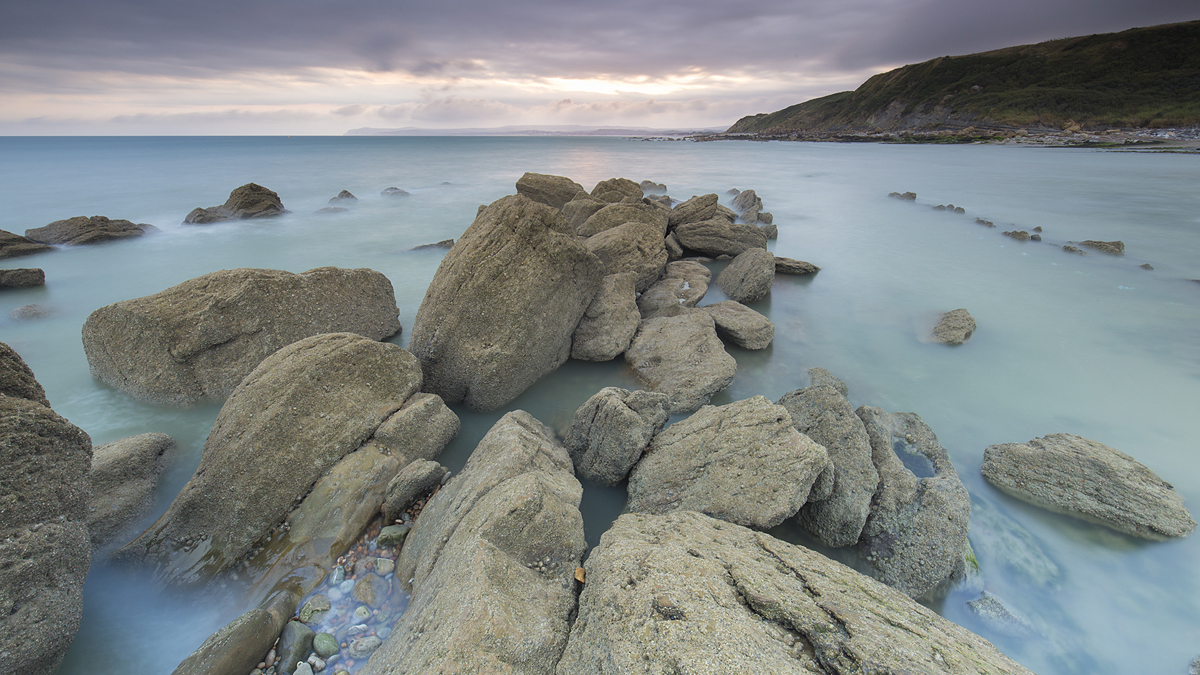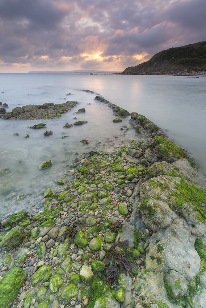 De volgende ochtend toch wel een lichte teleurstelling dat ook nu het water weer hoog stond en omdat dit strand geen mooie witte stenen had was het veel lastiger een goede compositie te zoeken. De grote donkere stenen maakten het daarbij niet eenvoudiger! Opeens viel mijn oog op een grote ronde knalgroene steen die daar tussen de bruine rotsblokken lag te pronken. De stenen waren spekglad vanwege het wier dus héél voorzichtig op de rotsen geklommen en mijn statief bovenop een stevige rotsblok weggezet en gezocht naar de juiste compositie. Bij de eerste foto’s stond er rond de steen nog geen water en was het geheel nogal massief, maar na 10 minuten kwam er water tussen de stenen door, waardoor die groene kei wat meer ‘los’ kwam te liggen en nog beter in balans was met de rest van de foto. Even daarna kwam er een golf over de steen en werd het groen te donker om nog lekker op te vallen.