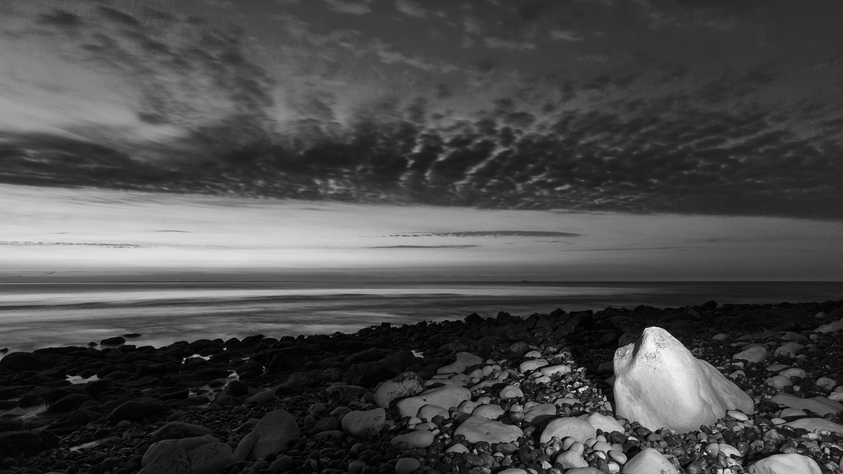 De tweede avond waren we op dezelfde plek als de eerste avond en blijkbaar waren er toch mensen enthousiast geworden over onze zomerse outdoor-outfit (i.c.m. met geoefend lichaam) want het was nog wat drukker op het strand. Maar ná 100 meter was het rustig en konden we ieder ons ding doen. De zee was ietsje ‘wilder’ en dat gaf mij kans om wat rust te krijgen in een foto van een stuk kust waar vrij veel (witte en donkere) stenen lagen. Die combinatie van m.n. die witte stenen en gekleurde kiezels was wél erg leuk trouwens en zie je ook niet zo vaak.