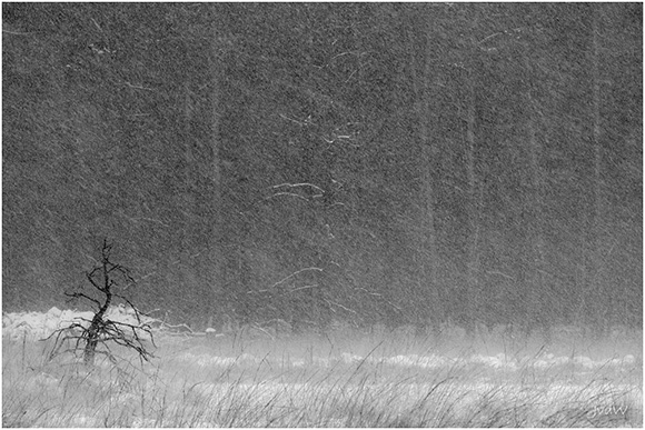 Soms heb je maar een half uur nodig voor een foto als je weet waar je naartoe moet gaan (mits het daar 'klopt' natuurlijk). Vorige week zondagmiddag had ik vanuit de auto dit boompje ontdekt. Ik zag het tussen de bomen door toen we 's middags gingen wandelen. Het was toen echter zonnig weer en het had net wat gevroren. Ik bedacht me toen direct dat dit wel eens een prima boompje zou kunnen zijn om tijdens een sneeuwbui te fotograferen! En vanochtend sneeuwde het eindelijk (in ieder geval op een tijdstip waarop ik de mogelijkheid had om te gaan fotograferen). Maar wél later dan die fantastische weer-app's gisteravond aangaven en pas rond 11 uur zag het er goed uit!