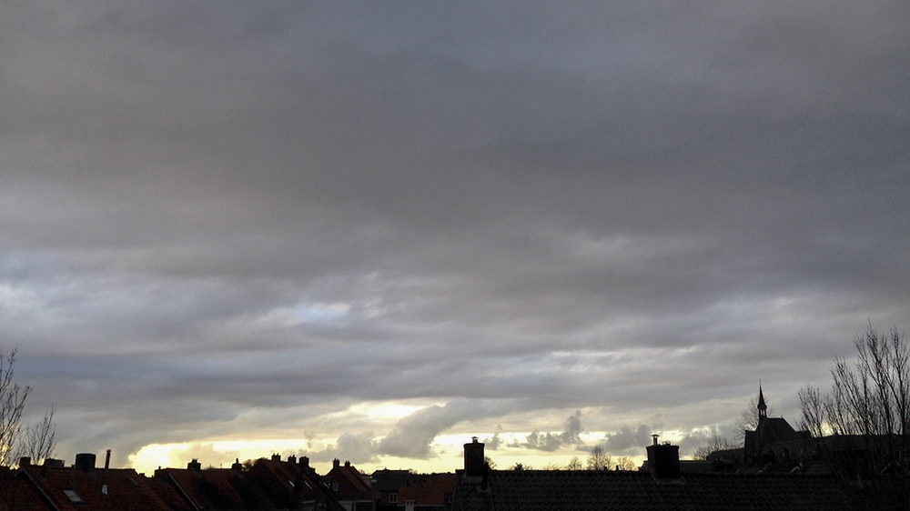 In de auto zie ik dat de lucht nu ook boven m’n hoofd wat open trekt. Bovendien lijkt de onderlaag in het westen vrij te komen van wolken. Het zou kunnen dat de zon dan mooi van onderuit de wolken kan beschijnen en zie in mijn gedachten al een rood-oranje deken boven m’n hoofd hangen.. Het enige rood wat ik overigens ‘echt’ zie is het rood van de stoplichten!