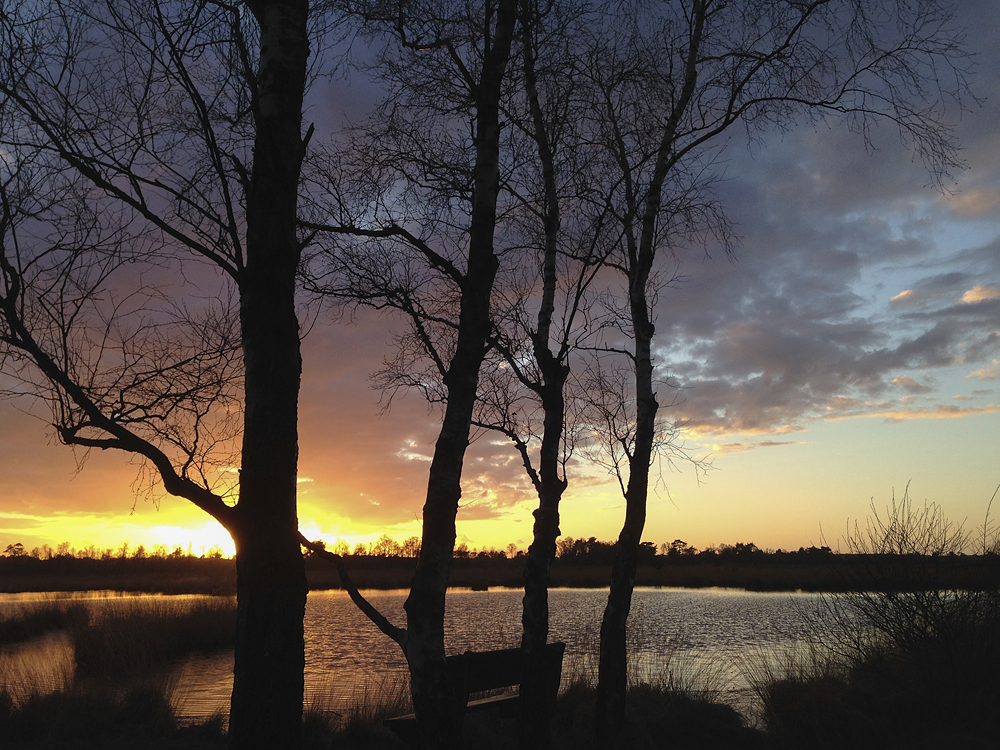 Ik rijd de parking op en zie een felle ondergaande zon tussen de bomen door. Snel spullen pakken en naar het ven.
