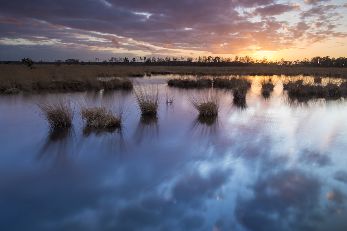 Aangekomen bij het ven eindelijk ‘vrij’ uitzicht naar het westen! Ik zie een aardige lucht met mooie losse wolken en een lichte oranje-rode gloed aan de onderkant van de wolken. Ik kijk naar het water en zie dat er door de wind veel beweging is op die plek. Niet goed voor de beste reflectie, dus ik besluit een klein stukje door te lopen waar minder wind staat.