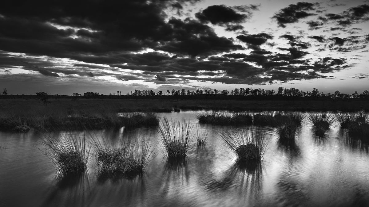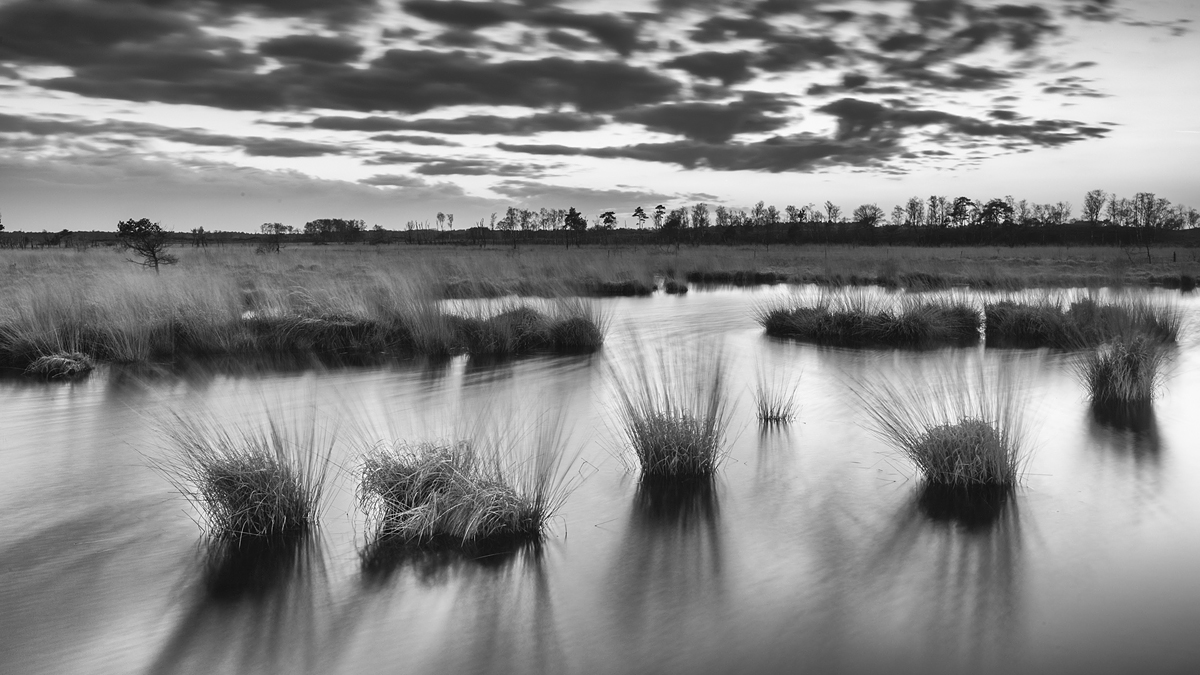 De foto’s die ik maak zijn duidelijk minder dan de eerste zes foto’s. Gelukkig zit er nog een zwart-wit modus in m’n hoofd van vanochtend en maak ik wat foto’s met het plan ze om te zetten naar zwart-wit. Ik probeer zelfs nog wat lange sluitertijden, maar de wolken aan de rechterzijde lijken ‘op te lossen’ waardoor de balans tussen het linker- en rechterdeel van de lucht niet meer optimaal is. Ik geniet nog wat van de stilte en hoor alleen wat groepjes kleinere zangvogels; heerlijk!