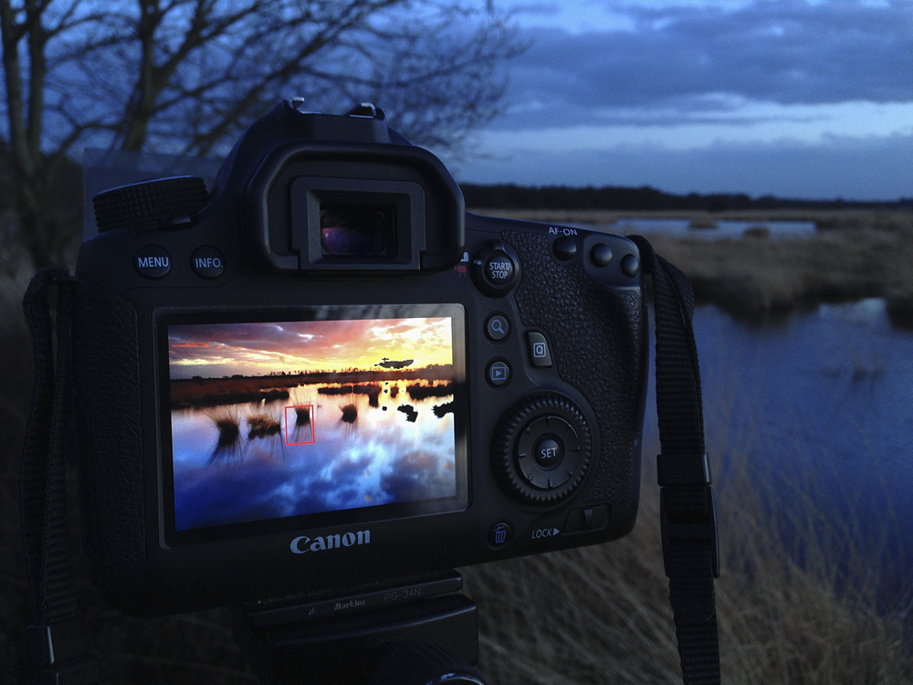 Statief uitdraaien, polarisatiefilter en grijsverloopfilters erop. Ik maak snel een foto want zie dat het al ‘goed’ is. Ondanks het grijsverloopfilter heb ik iets teveel licht in het deel waar de zon ondergaat, dus maak ik een trapje met 3 belichtingen! Omdat mijn statief met 2 poten en één been van mezelf op een soort drijvende graspol sta moet ik heel stil staan om de camera niet te laten bewegen.