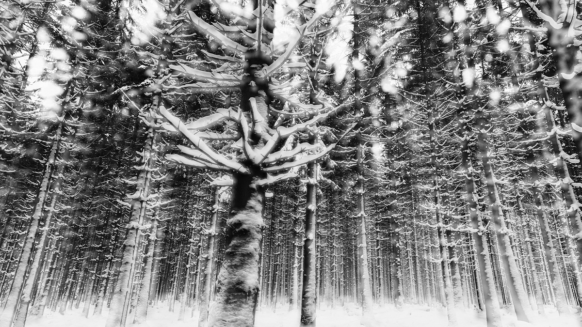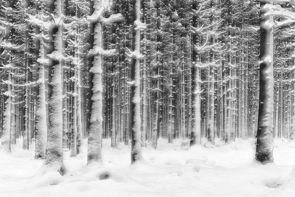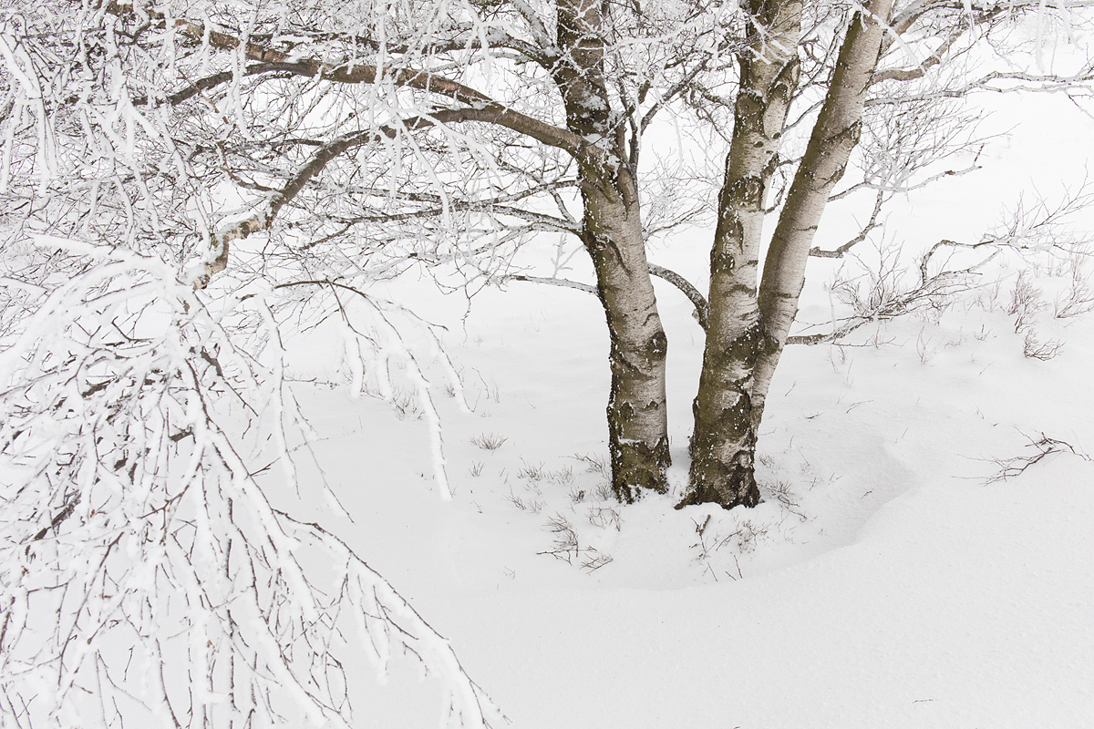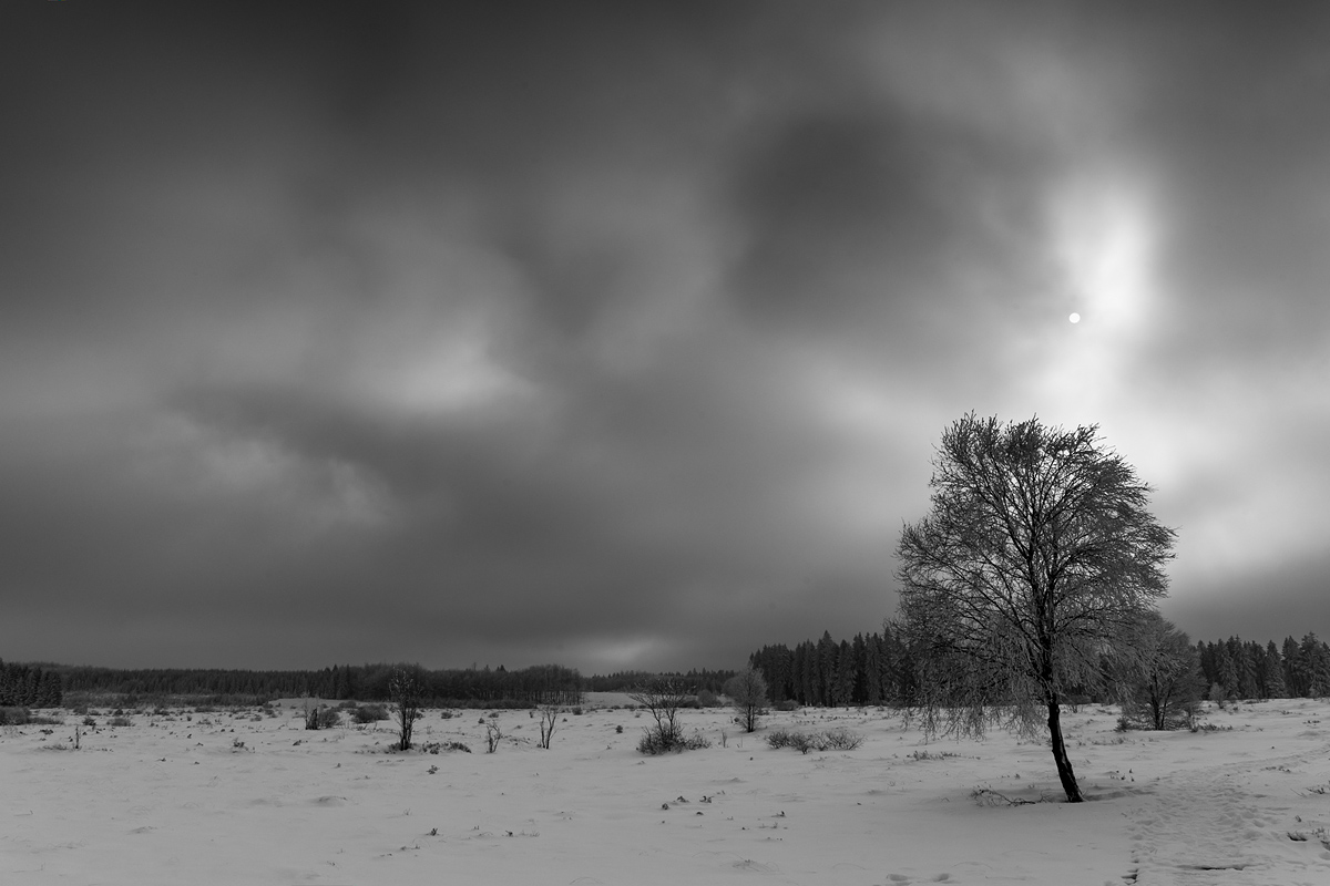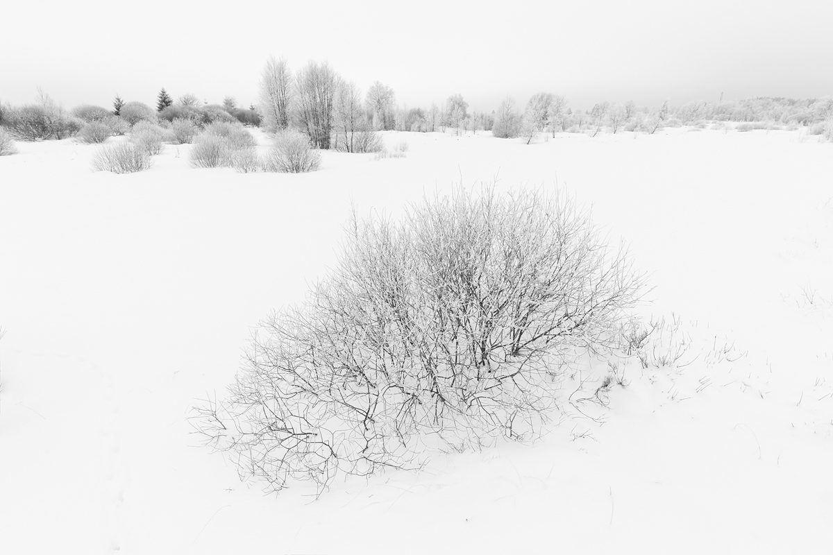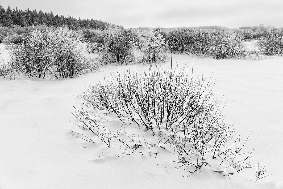 Hier wat foto’s van deze dag. Beginnend met de foto’s van het hoogveen gebied. Alles ruim belicht om zo witte sneeuw te krijgen en vooral gestoeid met de compositie. Omdat de sneeuw naast het knuppelpad óf niet toegankelijk óf niet te belopen was moest ik iedere keer een plek zoeken op dat 80cm brede paadje waar maar net het statief op paste. Daardoor was de speelruimte beperkter dan normaal. Die kale struiken met hun gebolde vorm spraken me wel aan en alhoewel de kleurenfoto ook nauwelijks kleur bevat vind ik het grafische karakter bij zwart-wit net iets sterker.