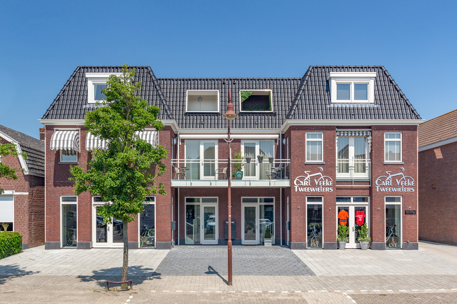 Ik was op de terugweg van een ander project en kwam langs Hoeven, het dorp waar het bewuste inbreidingsproject was gelegen. Midden in het centrum. Schuin tegenover een vestiging van Albert Heijn. Ik had niet het idee meteen de definitieve foto’s te gaan maken, want ik had nog niet de stand van de zon vooraf onderzocht met The Photographer’s Ephemeris (klik hier) en wist dus niet wat de meest geschikte tijd voor een mooie foto zou zijn. Het was meer een verkennend bezoek. En dat bleek niet overbodig, want Hoeven is een dynamisch dorp. Dus veel voorbijgangers en vooral veel parkeerders voor de lokale supermarkt. Ook zag ik dat op de begane grond een fietsenwinkel was gevestigd, die ter promotie veel fietsen voor zijn zaak had staan.