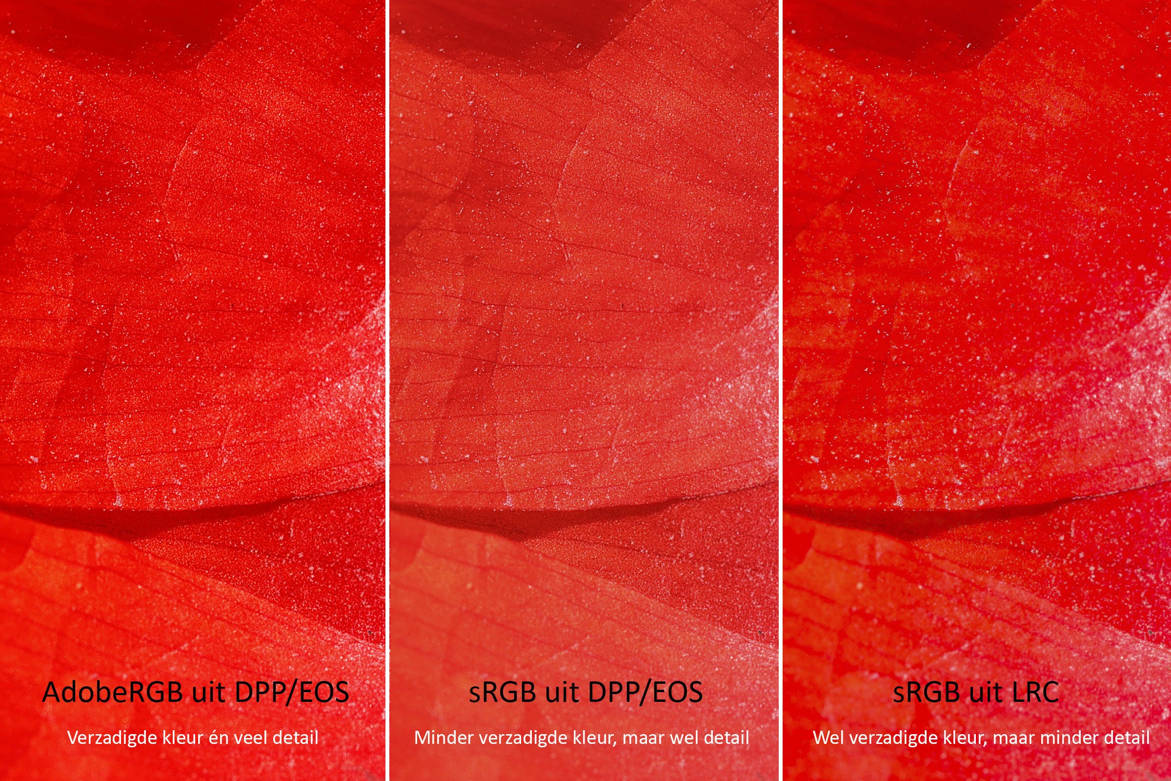 Nu is de theorie van kleurruimtes in zijn basis niet zo moeilijk (klik hier, 2009. klik hier, 2018), maar de hoofdbrekens ontstaan pas als je er praktisch mee gaat werken en moet relateren aan de invloed van bijvoorbeeld de kleuromvang van beeldscherm of printer of de keuze van de RAW-converter. Dan komen plotseling heel veel praktische parameters om de hoek kijken, die allemaal een rol spelen in hoe je de verschillen tussen sRGB en AdobeRGB (en ProfotoRGB) gaat ervaren.