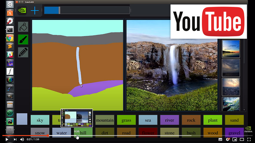 Nvidia (bekend van videokaarten) gaat nog een stap verder met Ai en heeft het over neurale netwerken bij hun project GauGAN. Daarmee kan van een abstract tekeningetje eenvoudig een realistisch beeld gemaakt worden. Kijk maar eens naar deze clip hoe eenvoudig dat is. Je hoeft dan niet meer naar de Alpen om een berglandschap te ‘fotograferen’.