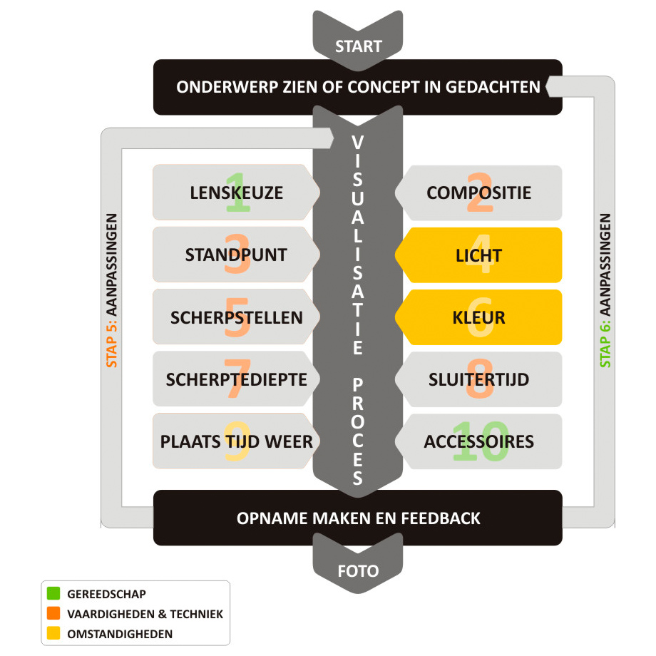 Licht en kleur zijn onmisbare onderdelen in de beleving van een onderwerp en als je je hiervan in een zekere mate van bewust bent, kun je hiermee de aard van je foto's sturen. Tevens zijn een goede voorbereiding, de juiste accessoires en een perfecte timing van cruciaal belang. Gedachteloos de ontspanner indrukken zonder kennis te hebben genomen van het licht zal zelden een 'winner' opleveren.