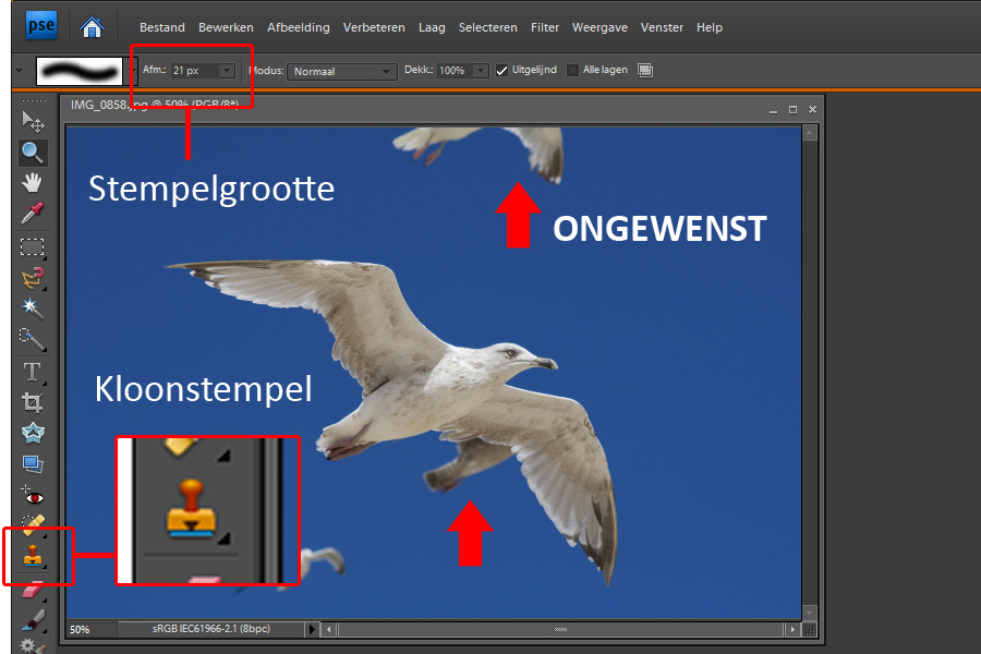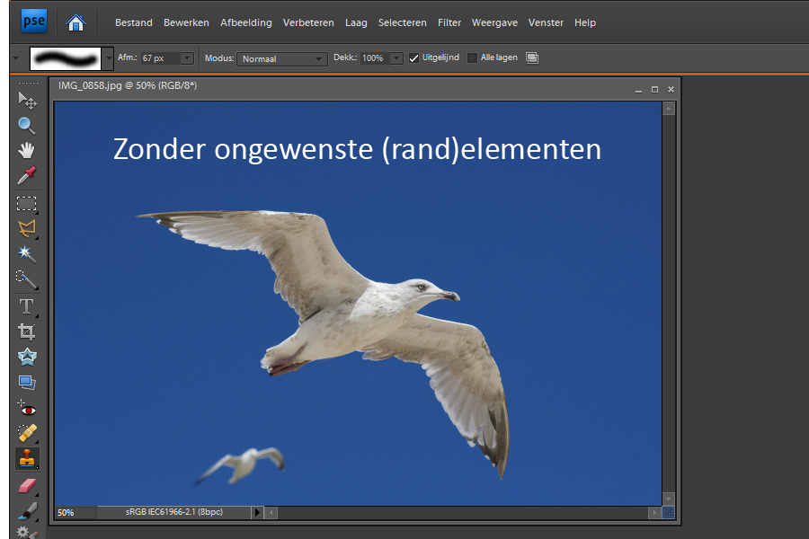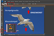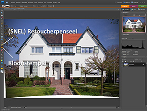 Een fenomeen van bijna alle spiegelreflexcamera's is dat het kader van de zoeker een iets kleiner beeld laat zien, dan de werkelijke opname. Er kunnen dus aan de rand van de foto kleine ongewenste zaken staan. Je kunt de foto dan natuurlijk bijsnijden om dit te verwijderen, maar ook gebruik maken van het Kloonstempel. Dit werkt hetzelfde als het Retoucheerpenseel, dus met het aangeven van de bron met Alt-klik. Nu worden de pixels echter 1 op 1 van de bron naar het doel gekopieerd, zonder dat met de omgeving van het doelgebied rekening gehouden wordt, zoals dat met de retoucheerpenselen het geval is. Je kunt dan heel concreet bepaalde gebieden overschilderen. Dat kunnen dus randelementen zijn, maar ook andere, grotere 'vlekjes' kunnen onzichtbaar worden weggewerkt.