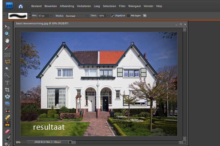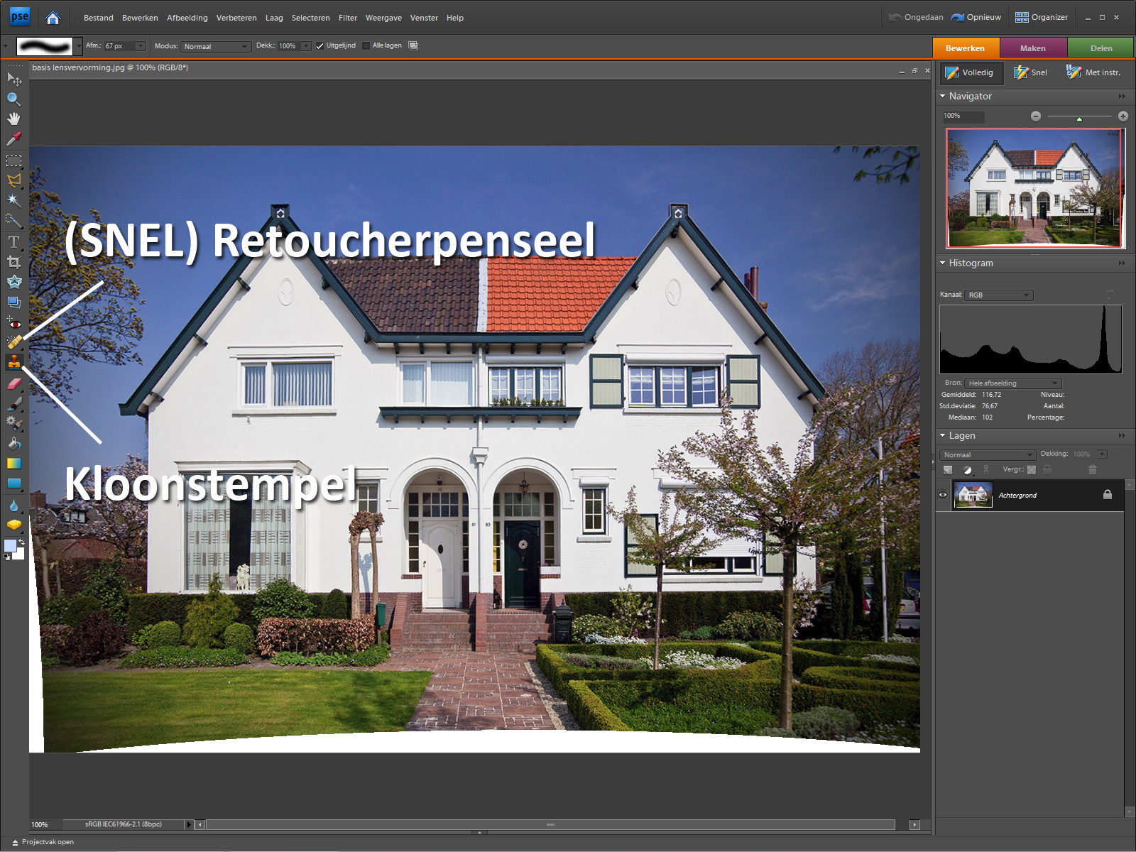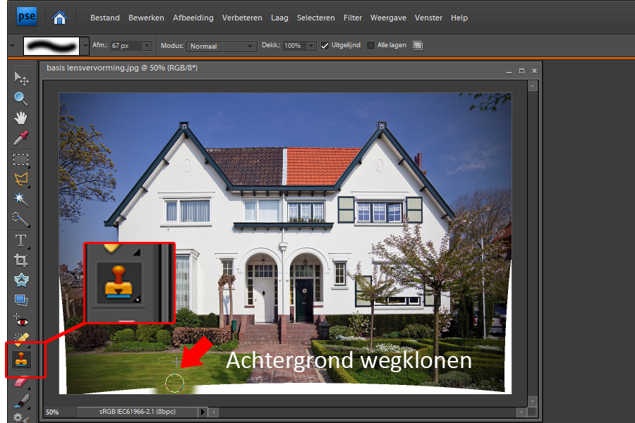 Het Kloonstempel kan ook goede diensten bewijzen als er witte achtergrond zichtbaar geworden is als je een foto gedraaid hebt of behandeld met het filter Cameravervorming corrigeren. Je schildert deze dan weg met naastgelegen identieke pixels.