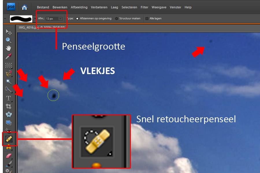 Photoshop Elements 7 heeft een speciaal gereedschap om dit soort pukkeltjes te lijf te gaan en dat is het Snel retoucheerpenseel (sneltoets J). Je vindt het in de werkbalk Gereedschappen (links naast het werkgebied) en de werking is heel eenvoudig. Kies dit gereedschap, stel een grootte in van het penseel en klik op een vlekje in de foto. Als bij toverslag verdwijnt dit en zo kun je doorgaan tot je een smetteloze foto als eindresultaat hebt.