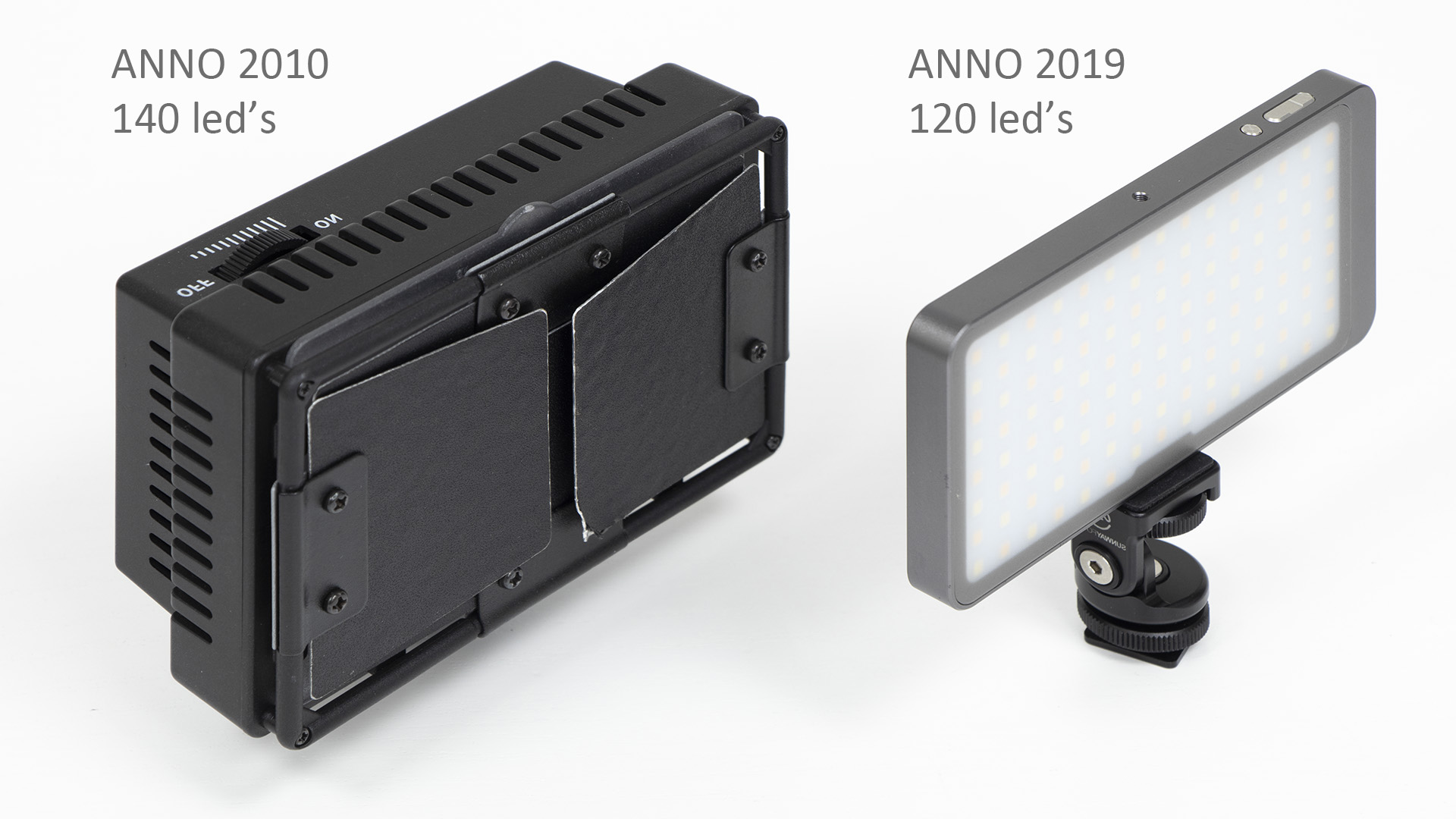 Voor de bespreking van LED-lampjes voor fotografie en video hebben we de beschikking over drie LED-lampjes van Sunwayfoto: de FL-54, FL-96 en FL-120, waarbij de afkorting FL staat voor ‘fill light’ en het getal het aantal ledjes aanduidt, waarvan de helft een kleurtemperatuur heeft van 3000K en de andere helft van 5500K, zodat het menglicht eenvoudig traploos tussen die waarden kan worden gevarieerd.