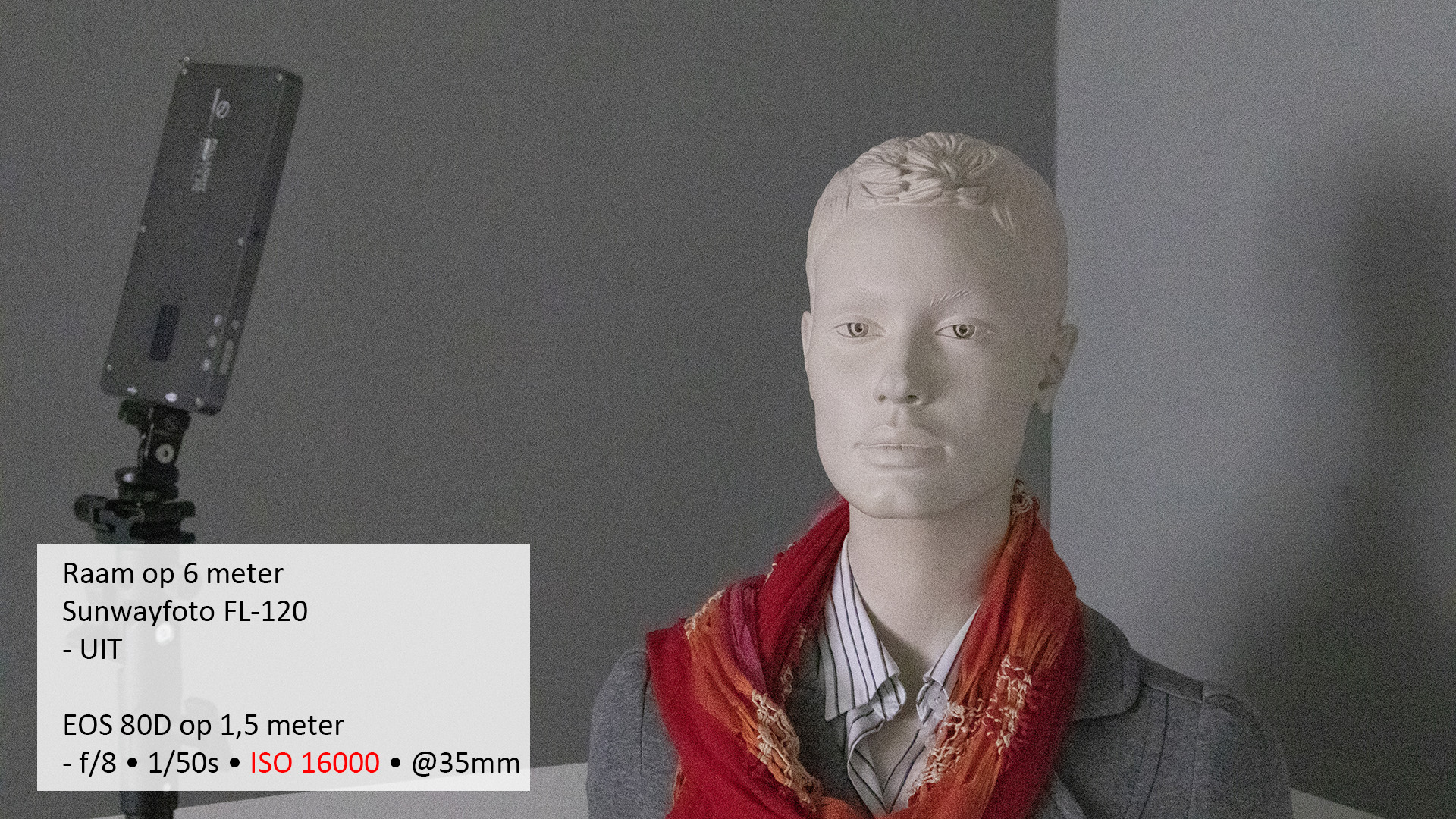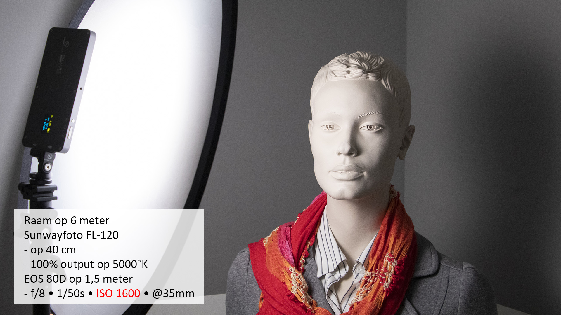 Tip Om de felheid van een zakformaat LED-lamp iets af te zwakken en het oppervlak van de lichtbron ook te vergroten, hebben we de diffusor van een reflectiescherm gebruikt. Het model wordt dan egaler aangelicht en ook een eventuele slagschaduw is veel zachter. Je levert dan natuurlijk wel een of twee stopjes licht in. |