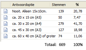 De uitslag van deze poll laat verder zien dat behoorlijk wat fotografen (bijna 20%) over een A3+ fotoprinter beschikt (45 bij 30 cm) en mogelijk ook zijn foto's aan de muur hangt of elders exposeert.