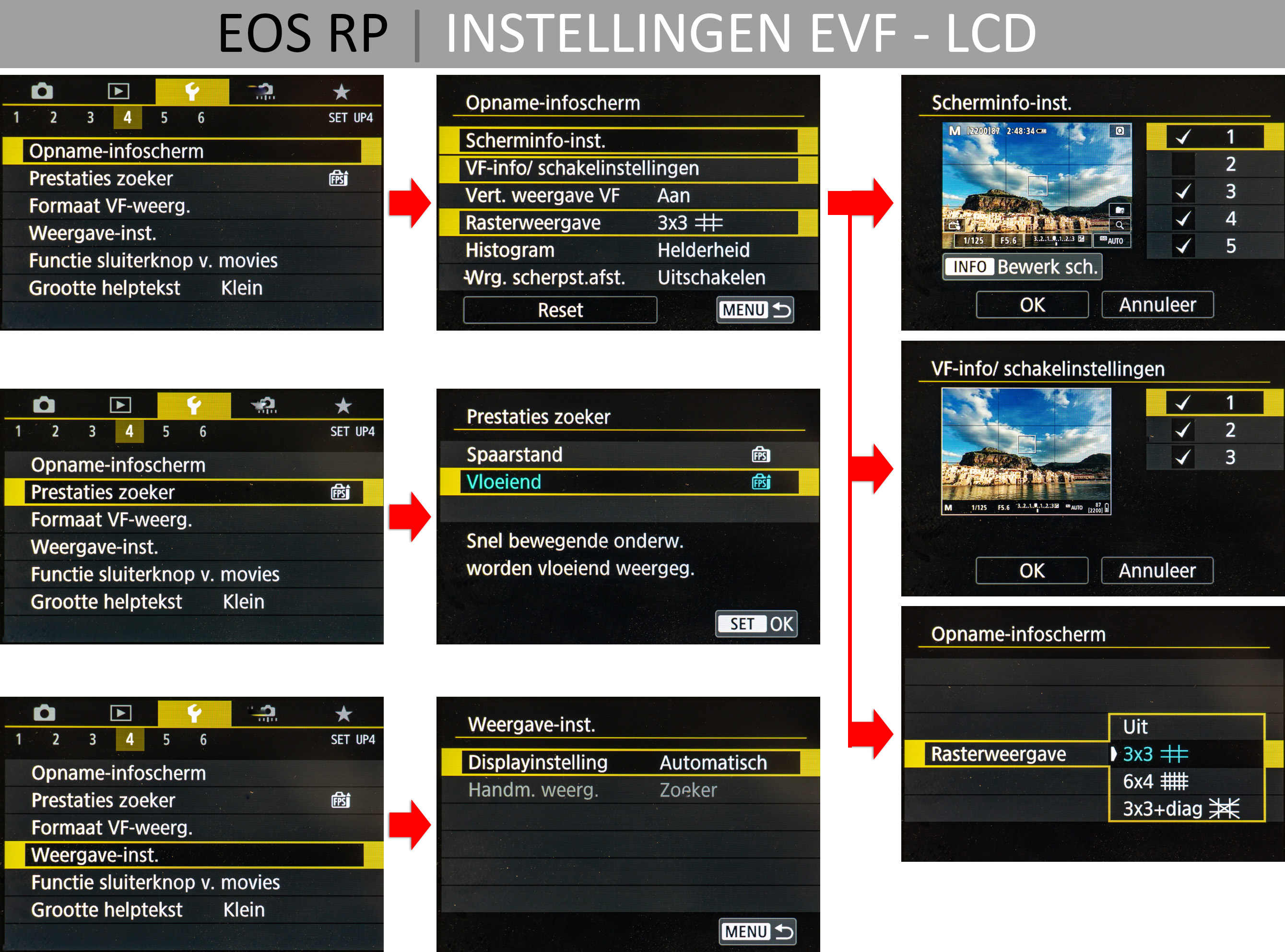 Let op dat de zoekersensor ook wordt geactiveerd als je met je vinger het LCD-scherm bediend, waardoor het LCD zwart wordt. Dat is redelijk storend, vooral bij het werken met een uitgeklapt LCD scherm. Bepaal met de menu-optie Opname-infoscherm wat je allemaal wilt zien in je EVF, waaronder een raster en waterpas.