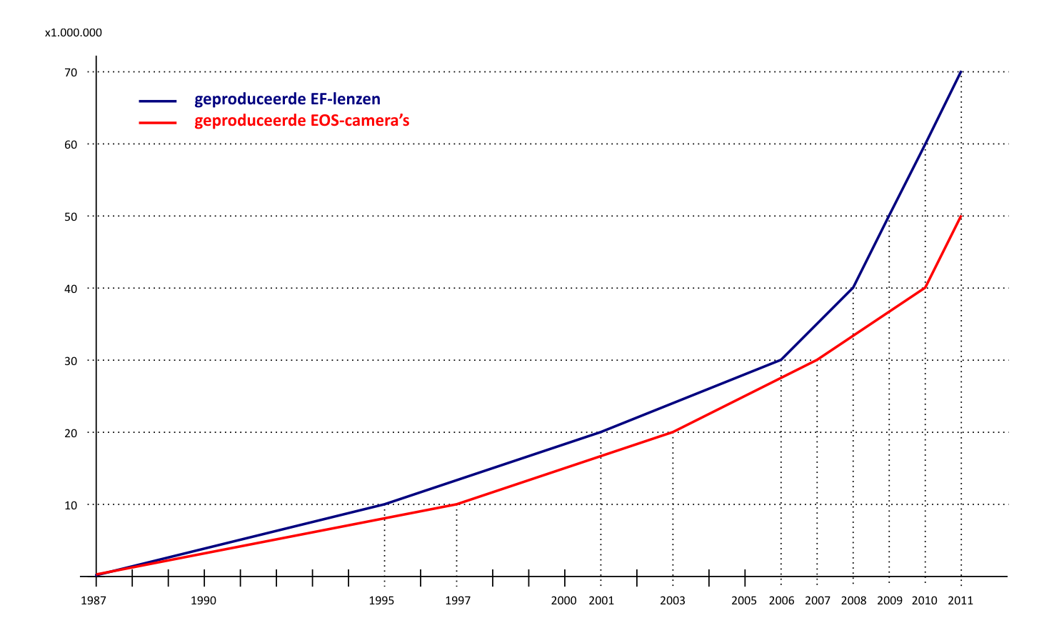 In 2006 bereikte de productie de mijlpaal van 30 miljoen objectieven en slechts twee jaar later werd in april 2008 de 40 miljoen gepasseerd. Dankzij de snel stijgende populariteit van de EOS-serie werd in december 2009 de 50 miljoen gehaald en in januari van dit jaar kwam het 60 miljoenste exemplaar op de markt. In oktober 2011 zal Canon in slechts negen maanden tijd de volgende 10 miljoen exemplaren hebben geproduceerd en daarmee de mijlpaal van 70 miljoen bereiken. Een ontwikkeling die het resultaat is van toonaangevende producten, zoals de nieuwe EF 8-15mm f/4L Fisheye USM – ’s werelds eerste1 fisheye zoomobjectief die cirkelvormige en rechthoekige beelden vastlegt met een beeldhoek van 180°.