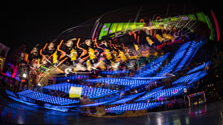 Je kunt de kermis op veel manieren in beeld brengen. Close-ups of verdichting met een telelens of speels met een groothoek. Met een fisheye is het leuk om aan de bijzondere beeldhoek ook nog beweging toe te voegen door een ‘lange’ sluitertijd te gebruiken bij bewegende attracties. Dat betekent dus een zo laag mogelijke ISO (100) en een zo klein mogelijk diafragma (f/22). Op een zonnige dag kom je dan maximaal tot 1/15s. Wordt de sluitertijd langer dan raakt de foto overbelicht. In RAW zou je de sluitertijd nog 1/3 of 2/3 stop op kunnen rekken tot 1/10s door later de hooglichten terug te halen. Overigens is RAW toch handig om een onderwerp als een kermis mee te fotograferen. Het geeft je meer controle over hoog contrast, over kleuren en over scherpte/ruis.