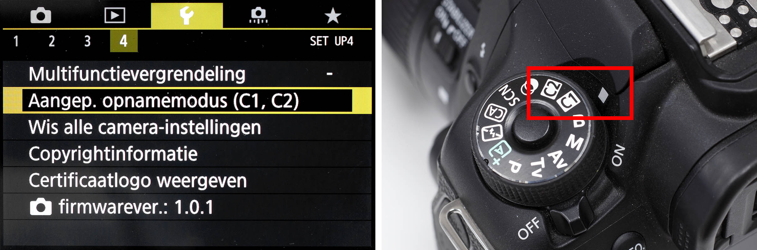 Custom settings Als je alle instellingen gedaan hebt op je camera, dan is het handig om ze als set op te kunnen slaan. Bijvoorbeeld voor het volgen van een bewegend onderwerp met Servo met de motordrive. Bij veel EOS-camera’s is dat mogelijk met de menu-optie Aangepaste opnamemodus. Als je dit gedaan hebt en je zet de Programmakeuzeknop van elke willekeurige stand op C1 of C2, dan heb je meteen alle benodigde instellingen actief. |
