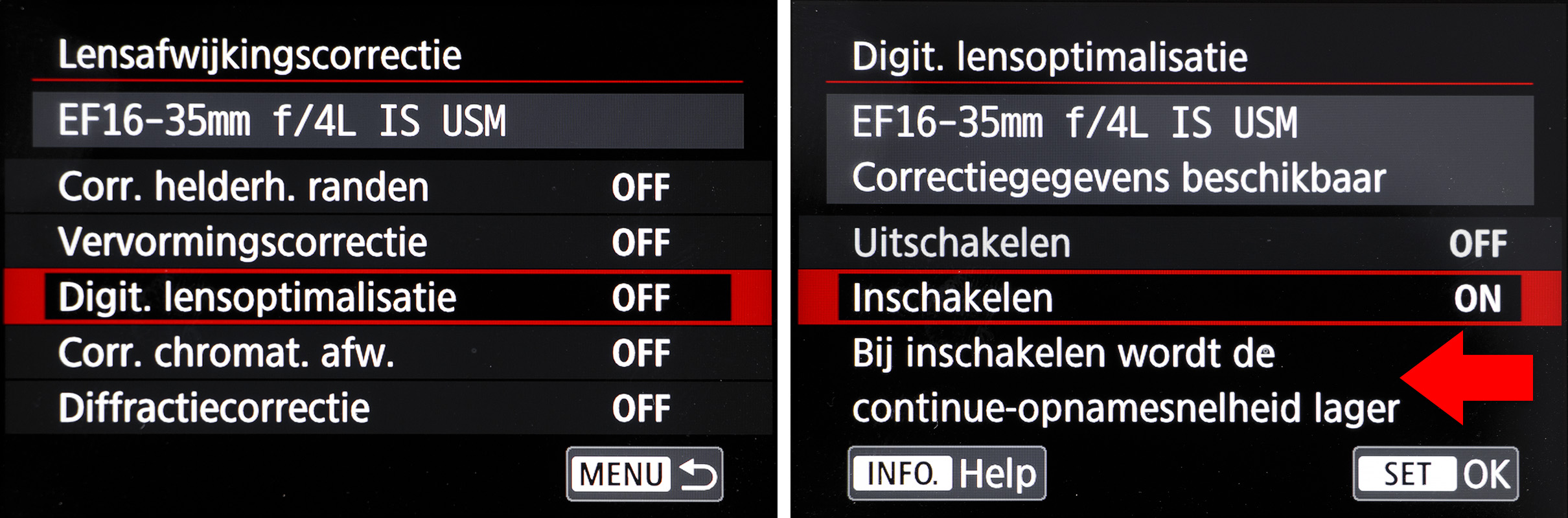Als je de ontspanner indrukt om een foto te maken, dan moet er vervolgens door de camera flink gerekend worden om de foto te kunnen laten zien op het lcd-scherm en weg te schrijven naar de geheugenkaart. Er worden allerlei beeldalgoritmes uitgevoerd en tevens beeldcorrecties toegepast. We noemen hier Lichte Tonen Prioriteit, Auto Optimalisatie Helderheid, Ruisonderdrukking, Anti-knipper en tot slot Lensafwijkingscorrectie. Dus wil je zo veel mogelijk rekencapaciteit beschikbaar hebben voor het wegschrijven van data, zet deze opties dan allemaal uit. Je kunt al deze facetten in JPEG en RAW desgewenst achteraf corrigeren in Photoshop. Fotografeer je in RAW, let dan op dat al deze ‘JPEG-berekeningen’ tóch uitgevoerd zullen worden. Bij voorkeur uitzetten, dus. Let hierbij vooral op de Lensafwijkingscorrectie Digit. Lensoptimalisatie (DLO). Dit vertraagt een snelle serie-opname aanzienlijk, hetgeen ook bij inschakelen van deze optie wordt gemeld.