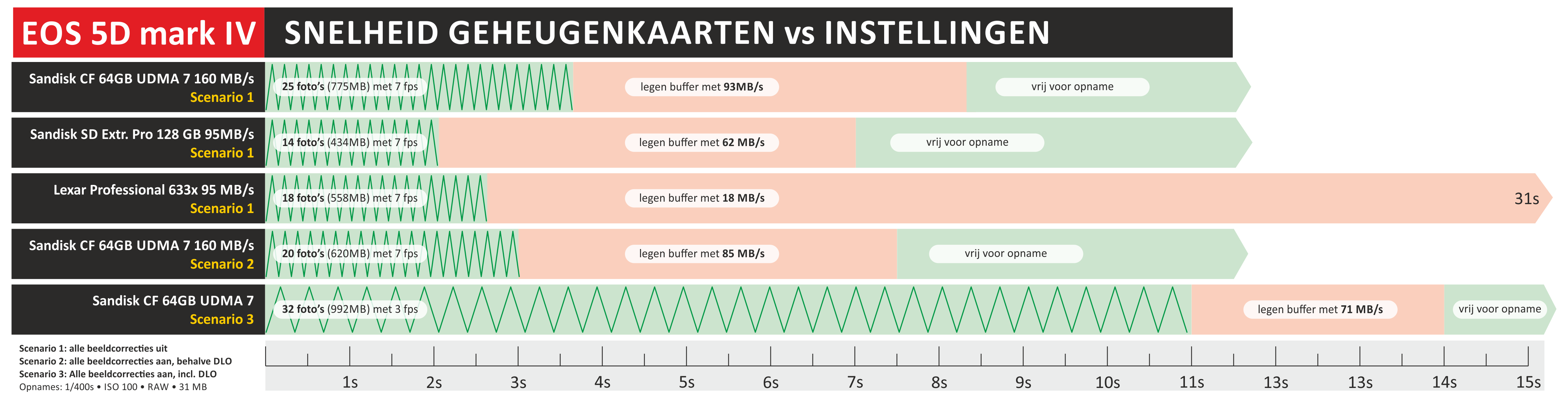De snelheid en vooral de duur van een serie-opname wordt natuurlijk ook bepaald door de schrijfsnelheid naar de geheugenkaart. De EOS 5D mark IV beschikt over twee kaartsloten (CF en SD) en is hierbij redelijk veeleisend, ook omdat je er hoge kwaliteit 4K mee kunt filmen (480 Mbps). Als je zomaar je kaartjes gebruikt van je ‘oude’ camera, dan zal de EOS 5D mark IV waarschijnlijk niet zijn hoogste datasnelheid kunnen bereiken. De lage schrijfsnelheid van de ‘oude’ geheugenkaart is dan de beperkende factor. Deze schrijfsnelheid moet minstens 90 MB/s zijn. Wij hebben sinds het begin een Sandisk CF-kaart 64GB UDMA 7 (160 MB/s leessnelheid) gebruikt met een schrijfsnelheid van 150 MB/s en dat werkt als een zonnetje (serieopname 25 foto's: klik hier). Ook met een Sandisk Extreme Pro 128GB ondervindt de datastroom geen beperkingen (lees: 95 MB/s. schrijf: 90MB/s). We hebben er als test ook eens een oude Lexar Professional 16GB 633x (lees: 98 MB/s, maar schrijf: 20MB/s) ingestopt en dan gaat de motordrive snel door de knieën en moet je lang wachten voordat alle data is weggeschreven. In die tijd kun je de camera niet gebruiken. Bij de twee genoemde Sandiskkaartjes hebben we deze problemen niet en is de camera na een lange reeks binnen enkele seconden weer actief. Als je dus een EOS 5D mark IV aanschaft, koop er dan meteen snelle geheugenkaarten bij. Die zijn tegenwoordig heel voordelig. Wil je een praktijktest van de snelheid van geheugenkaarten, kijk dan op CameraMemorySpeed (klik hier en hier) of download deze lijst (klik hier).