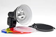 Reflector en snootOm met zachter licht te kunnen flitsen zijn er opzetstukken voor Speedlights die als reflector dienst doen. Ze vergroten het flitsoppervlak en verzachten daarmee de belichting. Dit geeft weer een ander resultaat den het verspreiden van het licht met een flitskapje. Dergelijke reflectors zijn er in veel soorten en maten. Van een simpele schotel tot een complete softbox. Een schotelreflector kan worden uitgebreid met een zogeheten honingraat om vanuit het brede oppervlak van de schotel het licht toch weer enigszins te bundelen. De uitvoering van de honingraat bepaald de mate van concentratie van het flitslicht. Dit is perfect te gebruiken als achtergrondhalo of haarlicht. Moet het licht nog meer gebundeld worden, dan is een snoot (spreek uit: snoet) een prima accessoire. Je kunt van je flitser dan een spotlicht maken en dat kan bij lowkey portretten mooie resultaten geven.