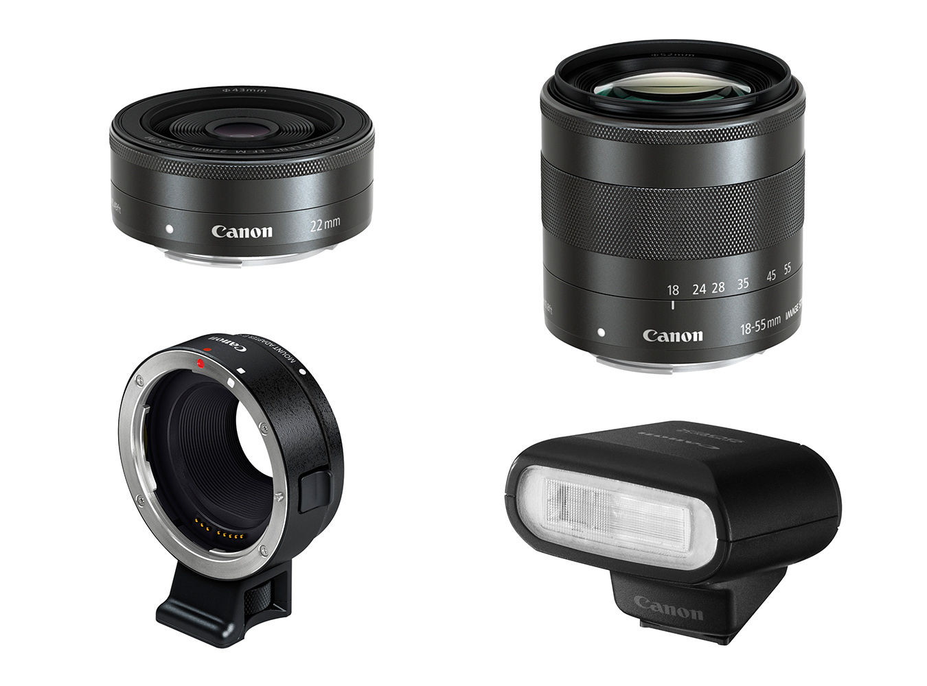 De EOS M heeft een andere lensvatting dan de overige EOS-camera’s en is dus niet direct compatibel met EF- en EF-S-objectieven. Canon heeft daarom twee nieuwe lenzen uitgebracht (EF-M 22mm 2 STM en EF-M 18-55mm 3.5-5.6 IS STM) en een adapterring voor EF- en EF-S-lenzen ontwikkeld. Aangezien een interne flitser ontbreekt in de compacte behuizing is de Speedlite-serie uitgebreid met de Speedlite 90EX.