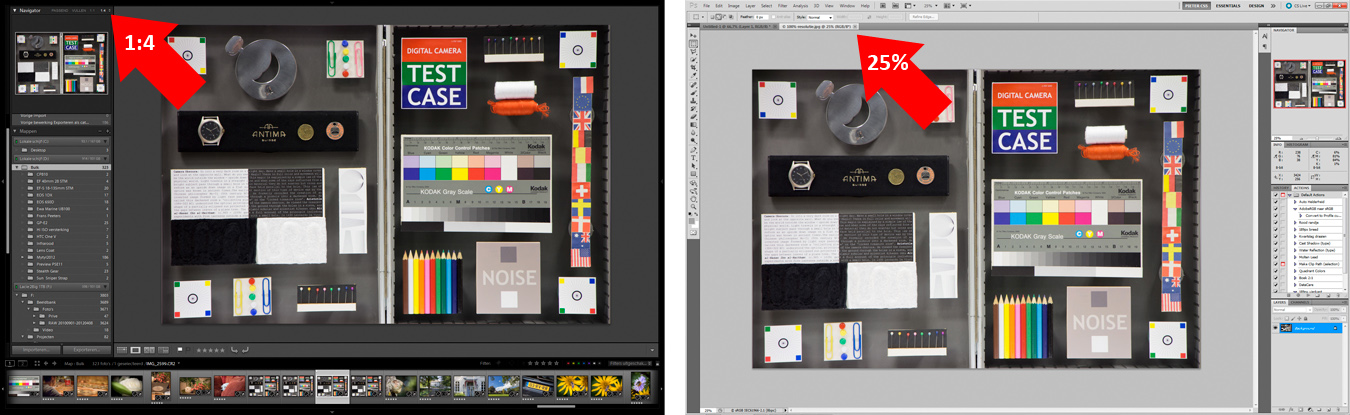 Nadat ik de foto’s heb beoordeeld, geselecteerd en eventueel aangepast, exporteer ik de RAW-beelden in hun originele resolutie van 18 Mp naar JPEG en open deze vaak nog in Photoshop CS voor een laatste controle. Als ik in dat programma dan naar het zoomniveau kijk van het venster waarin dit bestand wordt weergegeven, dan is dit 25%. Het is natuurlijk geen toeval dat dat hetzelfde is als de 1:4 in Lightroom en voor dit 25%-zoomniveau worden dus weer vier pixels van de foto samengevoegd in één pixel van het beeldscherm. Wederom zoom ik zelden in tot 100%. Deze 1:4 in Lightroom en 25% in Photoshop zijn dus de oorsprong van mijn ‘regel van ¼’.