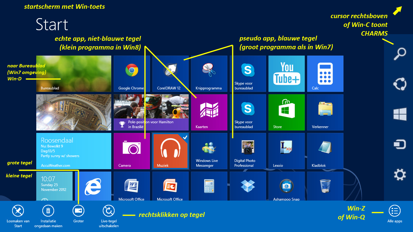 Windows 8 valt meteen op door zijn nieuwe welkomstscherm in de vorm van grote gekleurde vakken, oftewel Tegels. Een ontwerp dat door het leven gaat onder de naam Metro, naar de vorm van de tegeltjes veelgebruikt in de gangen van metrostations. Deze Metro-interface was al bekend sinds Windows Phone 7 en biedt een groter gebruiksgemak bij toepassing op touchscreens. Een andere ‘eyecatcher’ in Windows 8 - of liever het ontbreken daarvan - is de afwezigheid van de bekende Start-knop. Via die weg kun je dus geen programma’s meer starten. Dat is eigenlijk ook niet meer nodig, want programma’s in Windows 8 worden nu door Microsoft apps genoemd en net als op een tablet start je die vanaf een beginpagina, zoals je dat ook doet - en ondertussen gewend bent - op je telefoon of tablet. In analogie daarmee heeft Microsoft ook een Store in het leven geroepen, van waaruit je extra apps kunt downloaden (gratis of betaald). Je kunt de tegels van de apps in plaasting, grootte en volgorde zelf beheren. Veel gebruikte apps zet je op de beginpagina(s), de rest kun je vinden door rechts te klikken op de beginpagina en rechtsonder te kiezen voor de optie Alle apps.