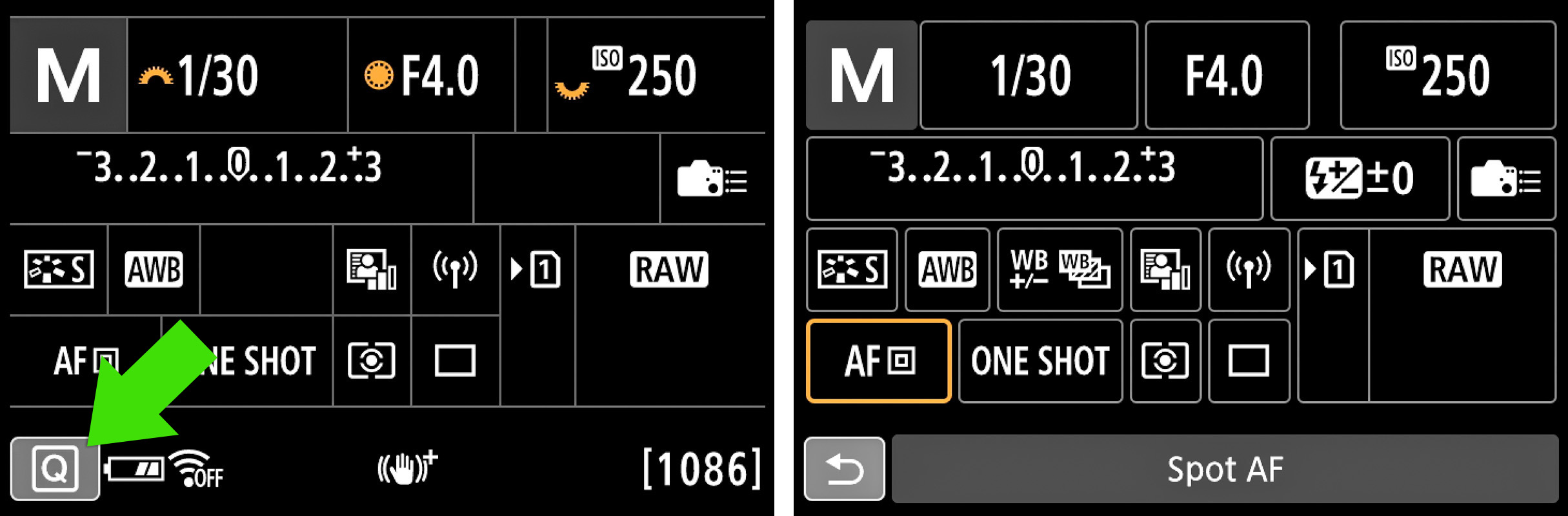 Quick Menu: Inactief (links). Activeren met Q-knop. Actief (rechts)