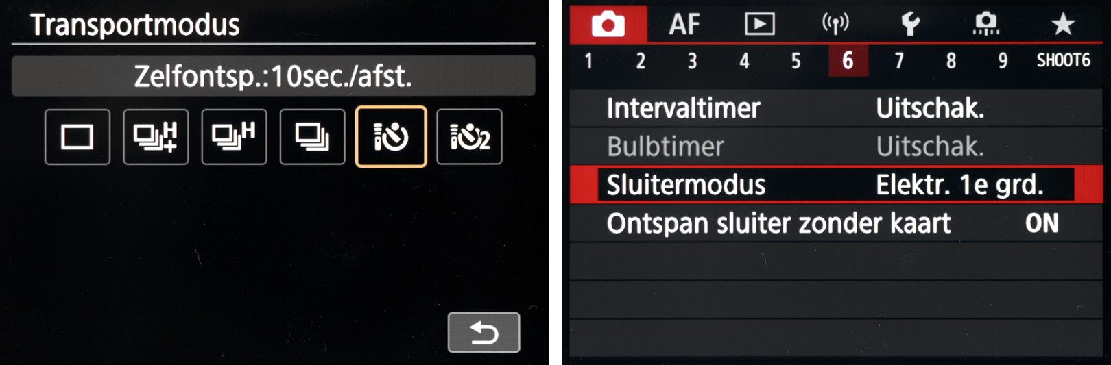 Bewegingsonscherpte camera Om elke vorm van bewegingsonscherpte van de camera te voorkomen is het raadzaam om met de zelfontspanner (2s of 10s) te werken. Of gebruik in combinatie daarmee de Camera Connect-app van Canon op je telefoon als afstandsbediening. Om onscherpte door beweging van de sluiter te voorkomen kun je bovendien de optie Sluitermodus op Elektr. 1e gordijn zetten of op Elektronisch. |
