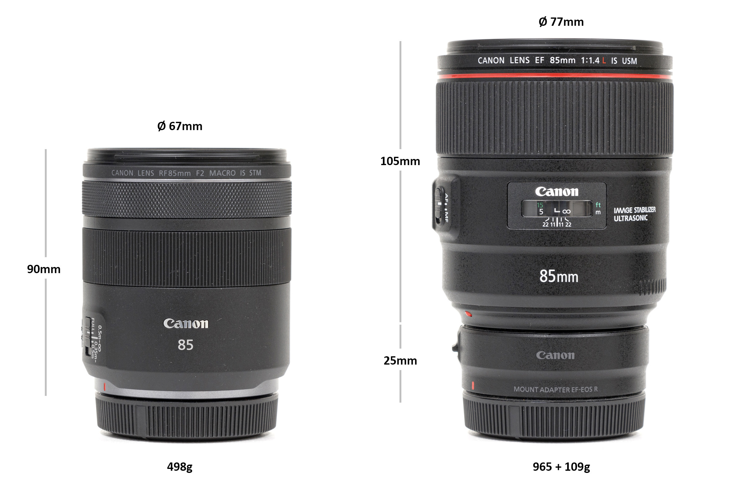 EF 85mm f/1.4L IS op 85 cm 1:8 (l) en RF f/2 IS op 35 cm 1:2 (r)