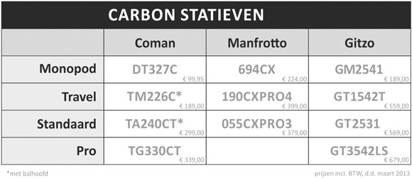 Een statief. Elke fotograaf zou een degelijk exemplaar in zijn accessoirecollectie moeten hebben, want een goed statief kan de kwaliteit van foto's soms meer verhogen dan een nieuwe lens of camera. De veel gehoorde klacht dat een driepoot zwaar is, is met de komst van carbon geen argument meer om aanschaf of gebruik achterwege te laten. Een stabiel standaardstatief mét balhoofd hoeft met carbon niet meer te wegen dan 1800 gram. Mocht de prijs van carbon tot voor kort een bezwaar zijn, dan is die drempel sinds de introductie van een merk als Coman verleden tijd en schaf je voor minder dan 300 euro een A-kwaliteit carbon statief mét balhoofd aan. Als je een dergelijk statief goed onderhoud, dan kun je daar vele jaren ongestoord plezier van hebben.