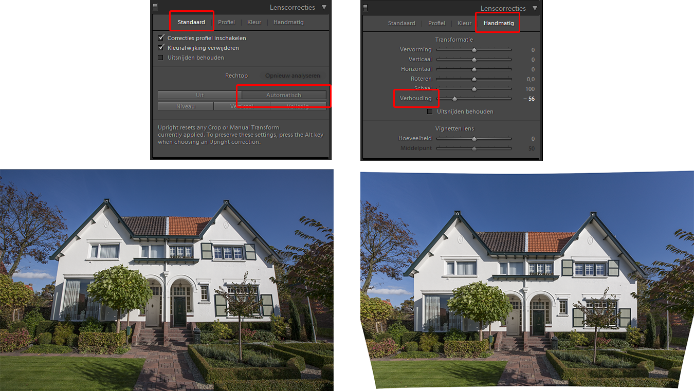 In het paneel Lenscorrectie in de module Ontwikkelen is de optie Standaard toegevoegd. Het is een venster waarin de automatische functies van Profiel (ton/kussenvervorming en vignette) en Kleur (chromatische aberratie) zijn opgenomen en aangevuld met de mogelijkheid om in één klik perspectiefverloop van gebouwen op te heffen of in een landschap de horizon recht te zetten. Lightroom is in staat om het onderwerp van de foto te analyseren en op basis daarvan de foto te draaien of te kantelen. Je kunt hierop geen invloed uitoefenen en wil je dat wel dan zul je de reeds bestaande optie Handmatig moeten gebruiken. Hierin is overigens de nieuwe optie Verhouding toegevoegd om onnatuurlijke verbreding of versmalling visueel te corrigeren.
