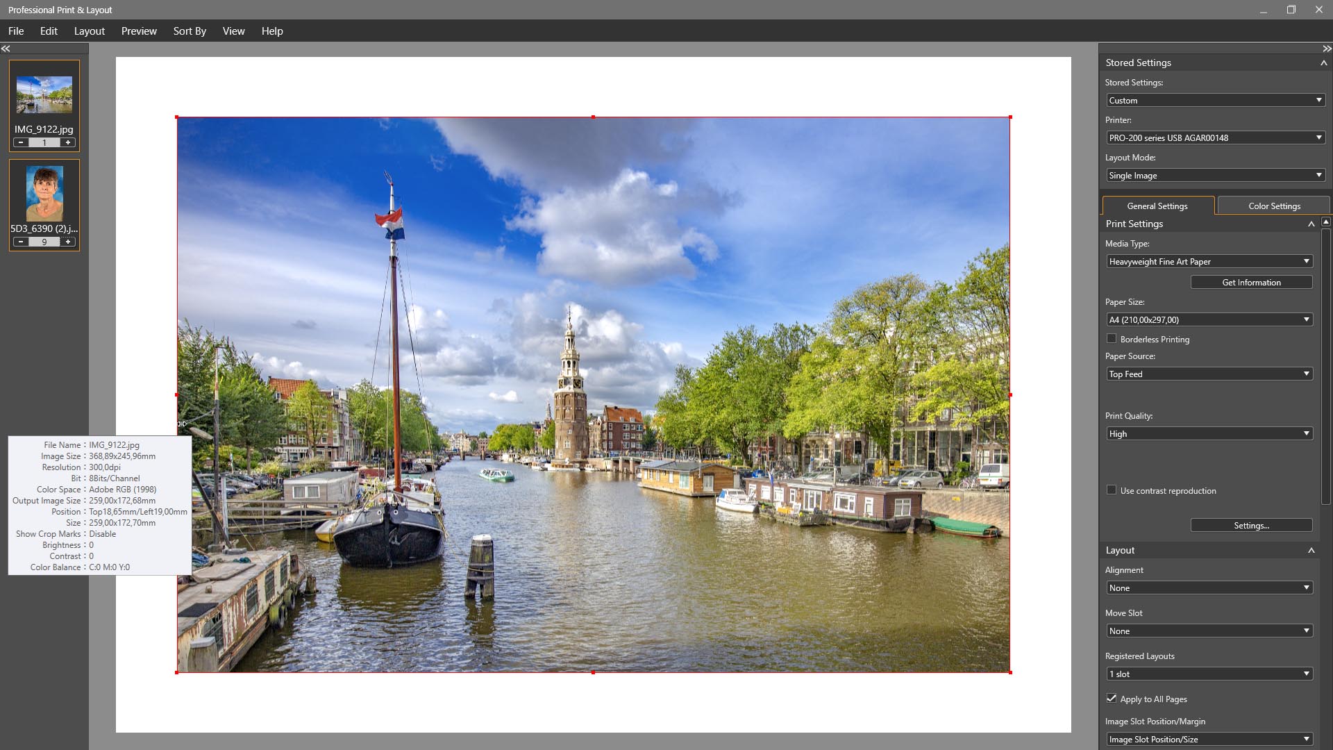 PPL De PIXMA PRO-200 kun je vanuit elke applicatie aansturen bij voorkeur vanuit Lightroom of Photoshop. Wil of kun je dat niet, dan levert Canon met de printer het gratis Professional Print & Layout (PPL) mee, waarmee je redelijk eenvoudig je foto’s op het gewenste formaat en de beste kwaliteit kunt afdrukken (software, videotutorials). |