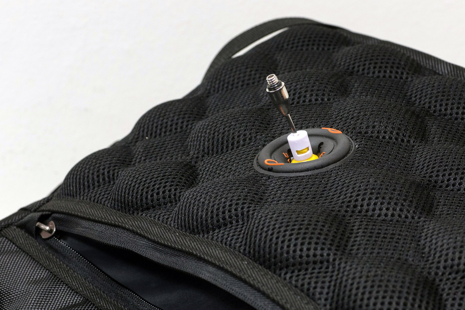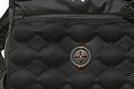 Tot zo ver is het - ook gezien het duurzame materiaal, de sterke ritsen en zorgvuldige afwerking - een prima fototas, maar is ze zeker niet uniek. Dat is ze echter wel door de toepassing van een luchtzak die zich in de bodem en onderin het ruggedeelte bevindt. Het is één zak die eventueel met een voetbalventiel kan worden opgepompt. De luchtdruk is zodanig gekozen worden dat het binnenwerk niet wordt gevoeld, maar dat er toch voldoende demping is. Dus niet te hard en ook niet te zacht. Dat zorgt er tevens voor dat de lucht zich enigszins van de onderzijde naar de achterzijde kan verplaatsen. Zet je je tas onbewust redelijk hard op de grond, dan vangt deze verplaatsende lucht de schok op. Hangt de tas op je rug, dan zal de beweging van de tas tegen de rug bij elke stap opgevangen worden door de lucht die zich verplaatst van de rug- naar de onderzijde.