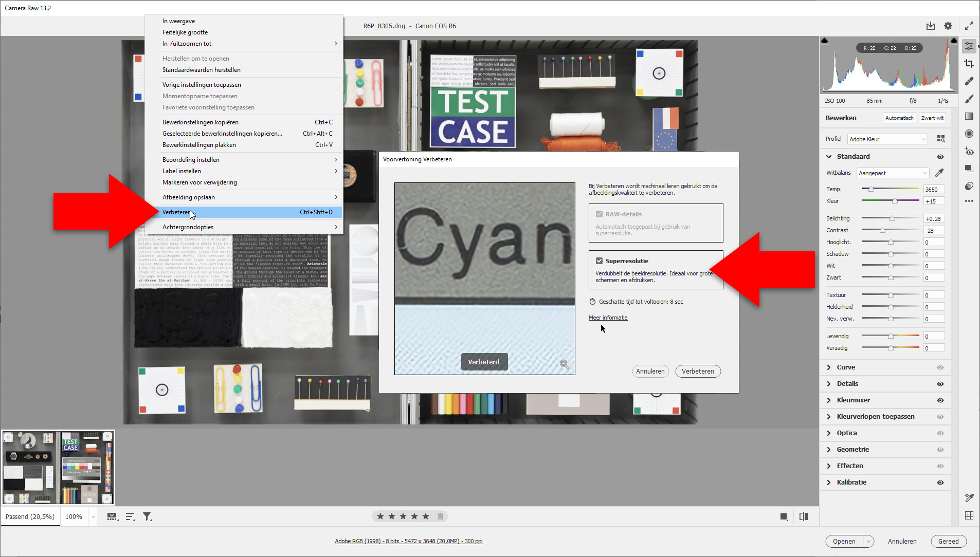 Het toepassen van Verbeteren, Superresolutie is eenvoudig. Open een RAW-bestand (CR2/CR3, geen S/M-RAW) in Photoshop. In het dialoogvenster van Adobe Camera RAW dat dan verschijnt, moet je rechts klikken op de voorvertoning van het RAW-bestand en kiezen voor de optie Verbeteren (Ctrl/Cmd-Shift-D). In het betreffende dialoogvenster vink je de optie Superresolutie aan en zonder verder iets in te kunnen stellen, klik je op de knop Verbeteren.