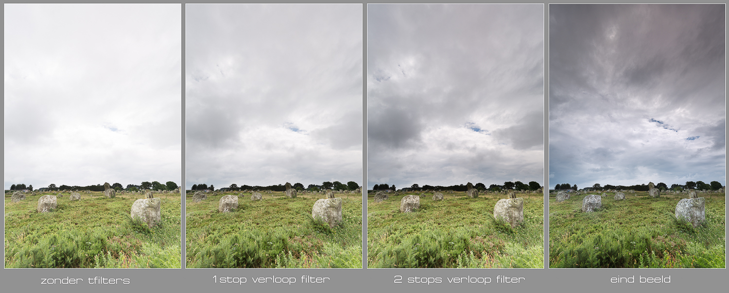 Ook belangrijk bij beelden zijn grijsverloopfilters. Deze komen ook in verschillende afmetingen, sterktes en kleuren. Je hebt de zachte verloopfilters (soft grad) en je hebt de harde verloop filters (hard grad). Hier een voorbeeld welk resultaat dit geeft op een beeld.
