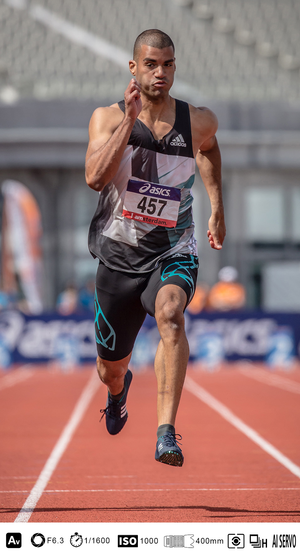 Bij andere disciplines zoals 100 of 200m sprint zul je moeten vertrouwen op de snelheid van de autofocus van je camera/lens combinatie. Vooral bij sporters die recht op je af komen lopen wordt veel van de kwaliteit van apparatuur verwacht. Indien je ook nog eens de techniek van Back Button Focus gebruikt (kortweg BBF genoemd) in combinatie met meerdere beelden / sec. dan is de kans op missers wel klein. Het is niet voor niets dat beroeps sportfotografen camera’s hebben die een een betrouwbaar en efficiënt autofocussysteem hebben. Denk hierbij aan de Canon EOS 1Dx-serie (full-frame) of de Canon EOS 7D Mark II.