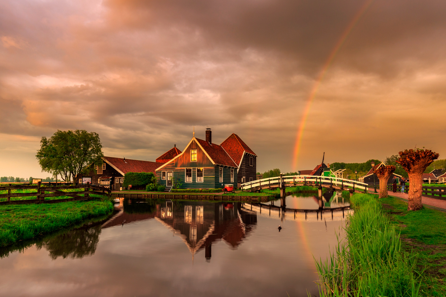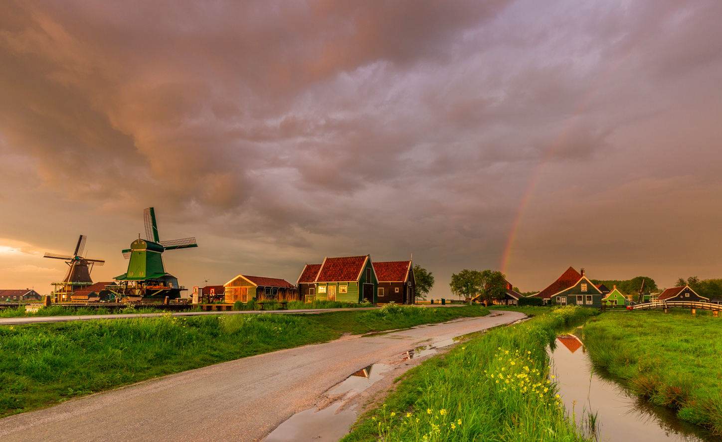 Snel het statief weer opgepakt - je weet nooit hoelang de regenboog blijft bestaan - en gelopen naar een overzichtscompositie. Als je snel moet werken is het altijd fijn dat je op een locatie bent waarbij je de composities al kent en weet dat ze werken. Bonus in dit geval was dat de regenboog ‘aangewezen’ werd door een wolkenformatie en de weg. Hierdoor kwamen alle elementen voor een interessante foto samen. Door de kleuren en het warme licht werd het een schilderachtige foto. Ik heb ervoor gekozen om iets onder te belichten om de sfeer van het moment vast te leggen.