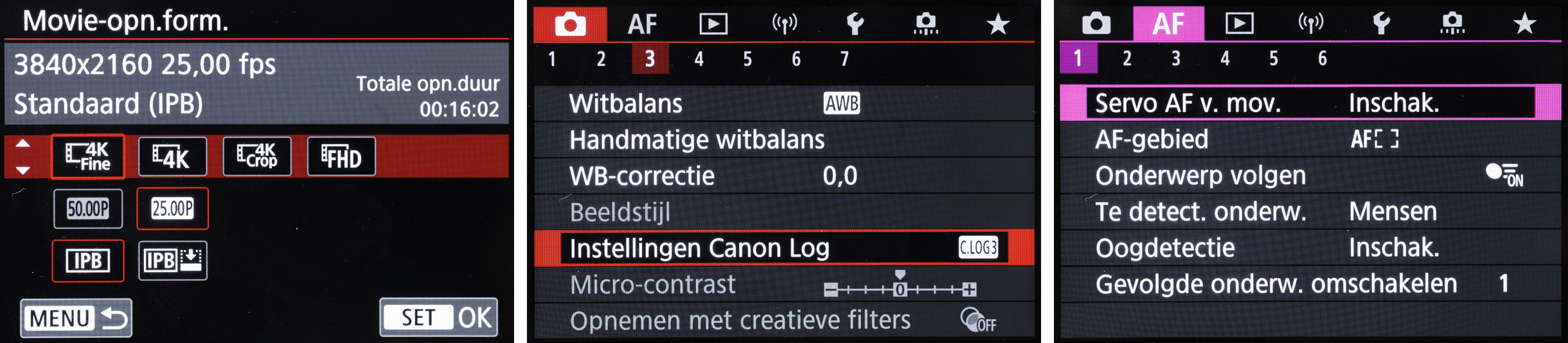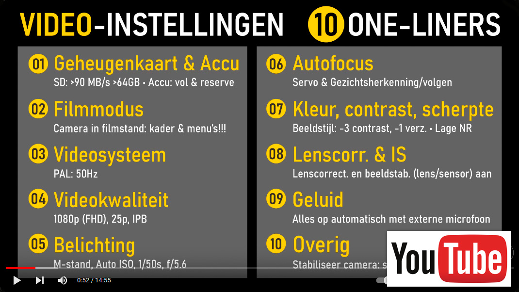Ik heb vele video filmpjes op YouTube gezien en heb daar de ‘beste’ instellingen uit gekozen. Is wel allemaal in het Engels, maar ik denk dat velen dat wel kunnen volgen (klik hier). Op EOSzine vind je ook een algemene, wat oudere video met ‘10 One-liners’ voor video-instellingen (klik hier).