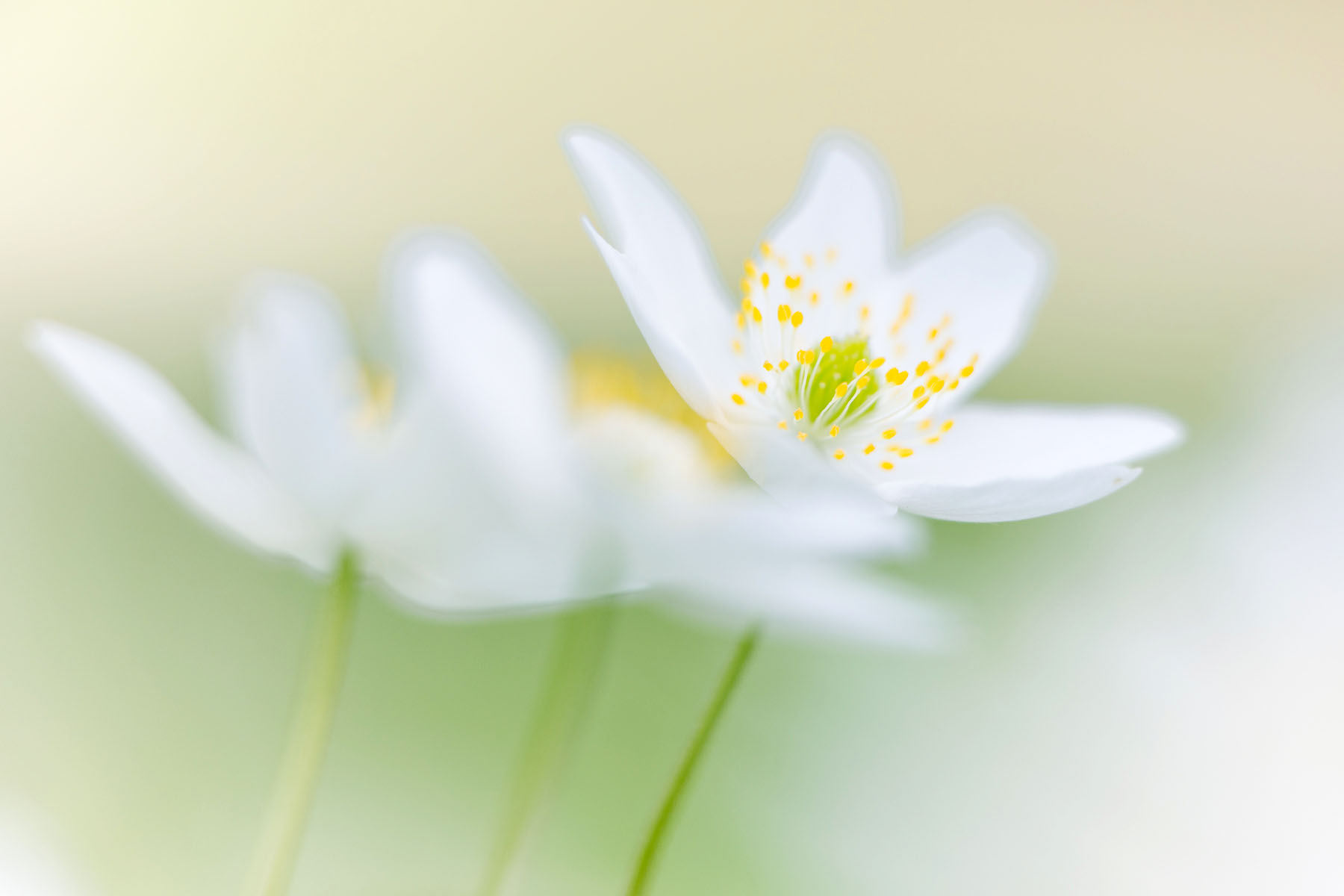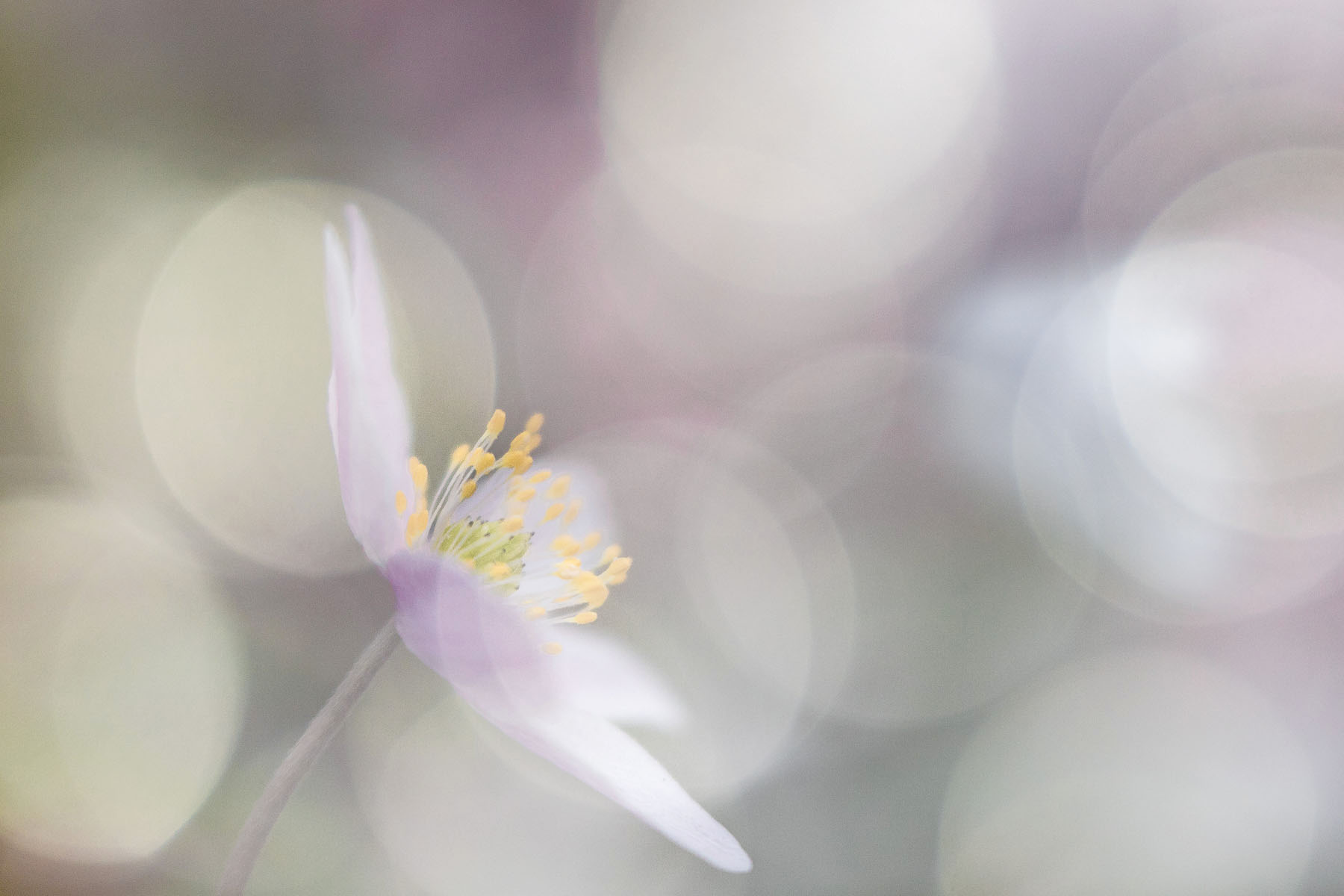 Macrofotografie leent zich ook mooi voor een meervoudige belichting. Bij mijn Canon EOS 6D mark II kun je in de camera zelf aangeven dat je twee opnames wilt samenvoegen tot een enkel beeld. De foto hieronder is daarvan een voorbeeld; een foto van lichtweerkaatsing in de sloot en een van een bosanemoontje over elkaar heen.