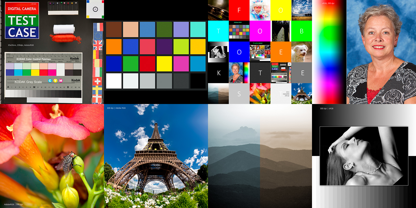 De testfoto’s (26 stuks, 30 bij 30 cm) die we in het fotoboek gebruikt hebben, zijn allemaal voorbereid en opgemaakt in Photoshop CC, zodat we ze meteen als JPEG of PNG paginavullend in de software konden plaatsen (vaak met de optie Foto als achtergrond). Enerzijds hebben we praktijkfoto’s gebruikt, zoals een portret, landschap, macro en monochromen (zwart-wit, sepia, cyanotype), maar anderzijds ook zelfgemaakte beelden met RGB-kleurvlakjes, kleurverlopen, grijswaarden schaal (verloop en blokjes) en foto’s van onze testcase (bevat lijnwerk) bij verschillende resoluties. Diverse foto’s zijn als sRGB én als AdobeRGB geplaatst. De foto’s zijn zo geplaatst dat ze als tegenoverliggende pagina’s eenvoudig vergeleken konden worden op verschil in resolutie of kleurruimte.