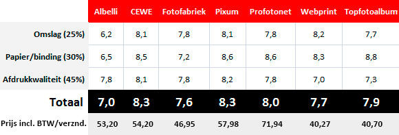 Ons tastpanel heeft onafhankelijk van elkaar bij daglicht de boeken anoniem beoordeeld op de punten (1) kwaliteit en beleving omslag, (2) kwaliteit en beleving papier/binding en (3) afdrukkwaliteit (kleur, helderheid, scherpte, monochroom) met een cijferwaardering van 1 t/m 10. Als referentie hadden ze de beschikking over fotoprints van de pagina’s afgedrukt op onze Canon iPF6450. Ook konden boeken onderling worden vergeleken. De resultaten zijn met een wegingsfactor (25%, 30%, 45%) per deelnemer gemiddeld en hieruit is een gemiddelde overall-score berekend.