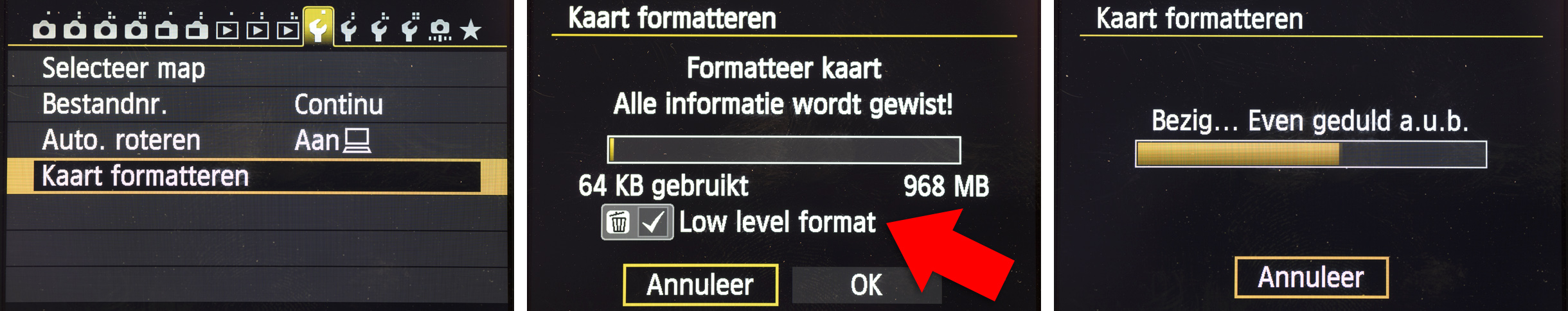 Het is verstandig om geheugenkaartjes regelmatig in je EOS te formatteren (niet op je computer). Gebruik je de normale methode, wat toereikend is voor standaard gebruik, dan is er kans op recovery. Doe je het Low Level, dan maak je echt alles leeg. Zolang je kaartjes niet traag worden of niet echt leeg hoeven zijn (verkoop, gebruik door derden), hoef je deze manier van formatteren niet uit te voeren.