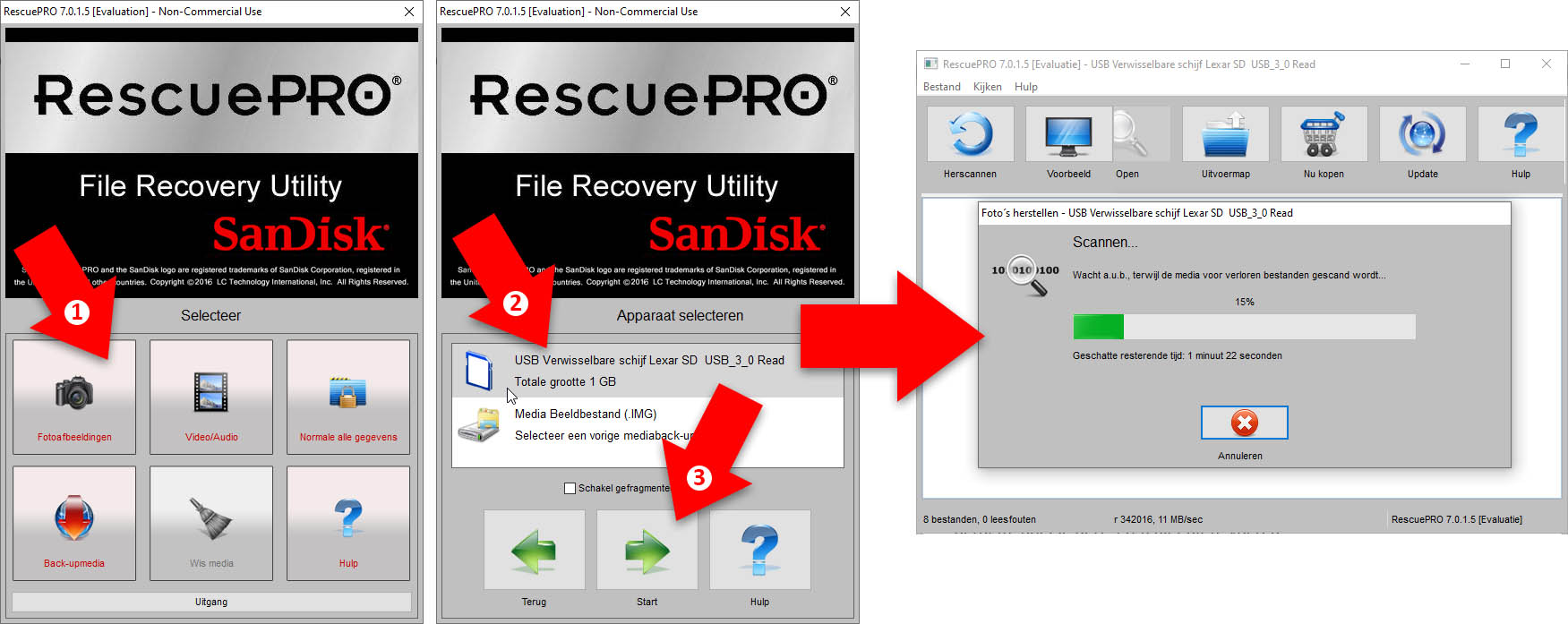 We hebben een SD-geheugenkaartje met ca. 75 foto’s op de standaard manier geformatteerd en zijn daarna direct met het programma RescuePro van Sandisk (klik hier) of Lexar (klik hier) op zoek gegaan naar de ‘verwijderde’ foto’s. Alle 75 bestanden werden teruggevonden, waarbij echter de originele bestandsnamen vervangen zijn door generieke namen als ‘Foto001’ en zo verder. De scan van 75 JPEG’s van 6 MB duurt ongeveer 2 minuten.