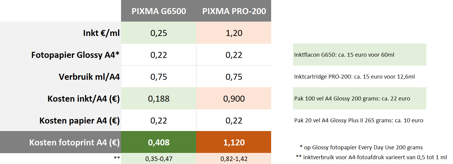 En hoewel we de kostprijs van een fotoprint altijd als laatste noemen in een review, doen we dat nu bij de PIXMA G650 juist als eerste met onderstaande tabel, die wat ons betreft alleszeggend is.