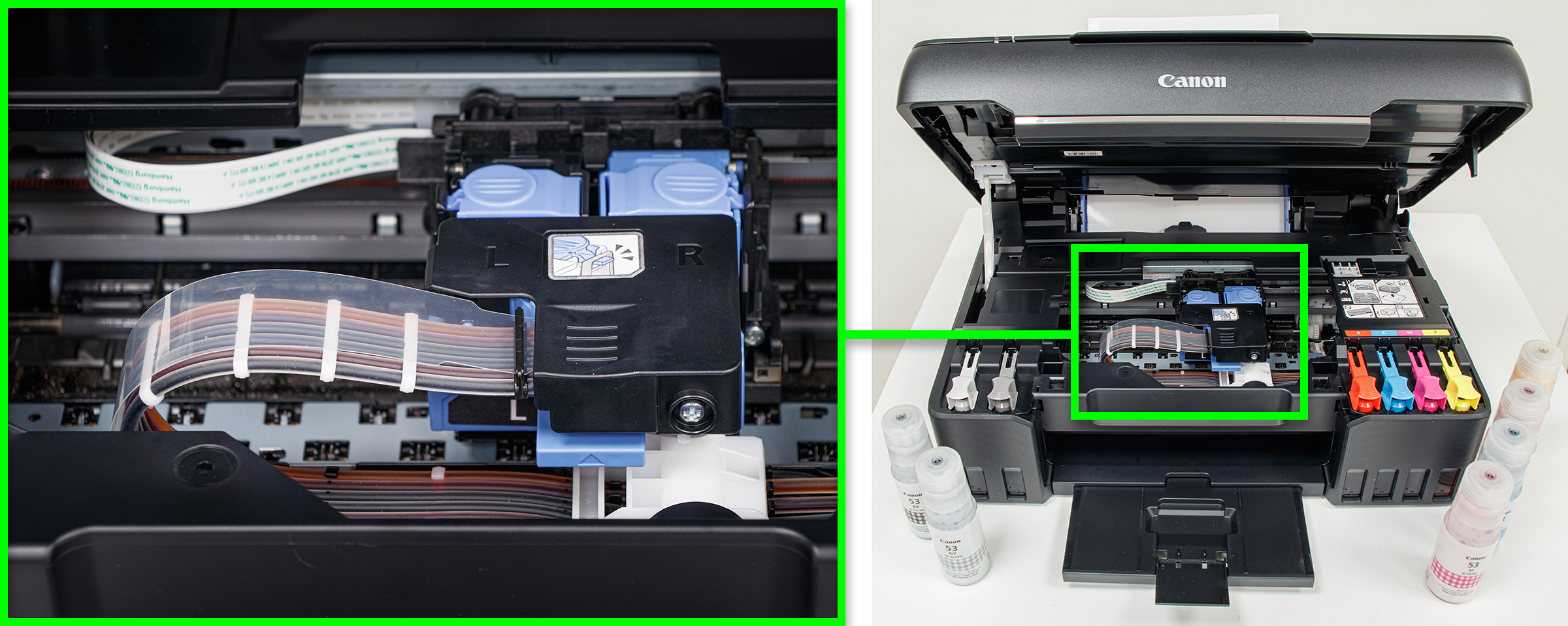 Tot zo ver de standaard multifunctional. Het bijzondere van deze refill-printer zit in de binnenkant. Bij een gewone inkjetprinter zitten de cartridges in de printkop en dat geheel gaat van links naar rechts v.v. over het papier. Lekker compact, maar deze mechanische beweging beperkt echter de grootte van de cartridges. Want als het gewicht van de inkt/print-unit te hoog wordt, dan verstoren de krachten bij versnelling en vertraging, de nauwkeurigheid tijdens het printen. De printsnelheid zou dan drastisch omlaag moeten. Bij de PIXMA G650 zit de inkt in stationaire inktreservoirs, die met afzonderlijke slangetjes verbonden zijn met een 2-hoofdige printkop (2x drie kleuren) die over het papier beweegt. Zo blijft het gewicht van de bewegende delen in een printer laag en de snelheid hoog. Dit principe van inkttoevoer wordt ook toegepast in grootformaat fotoprinters, zoals onze iPF PRO-2000. De techniek is iets gecompliceerder en maakt de printer daarmee iets duurder. Dit heb je overigens snel terugverdiend, dankzij de lage kosten per print.
