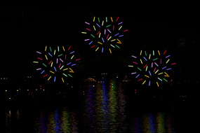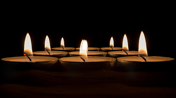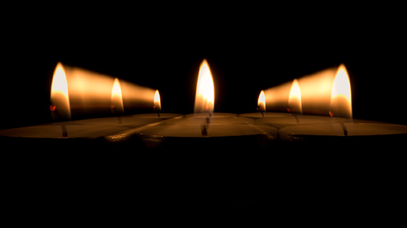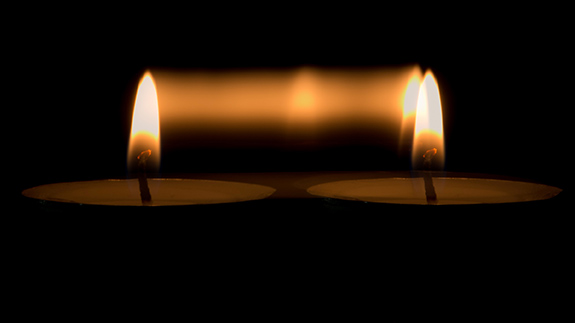 | Drievoudige belichting. Eerste belichting: kaarsje links. Tweede belichting: statiefkop iets horizontaal draaien tijdens het belichten. Hierdoor ontstaat een lichtspoor. Derde belichting: kaarsje rechts. |